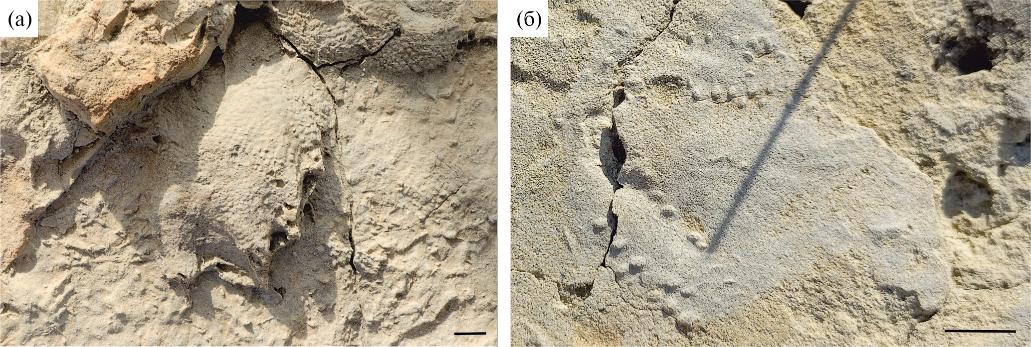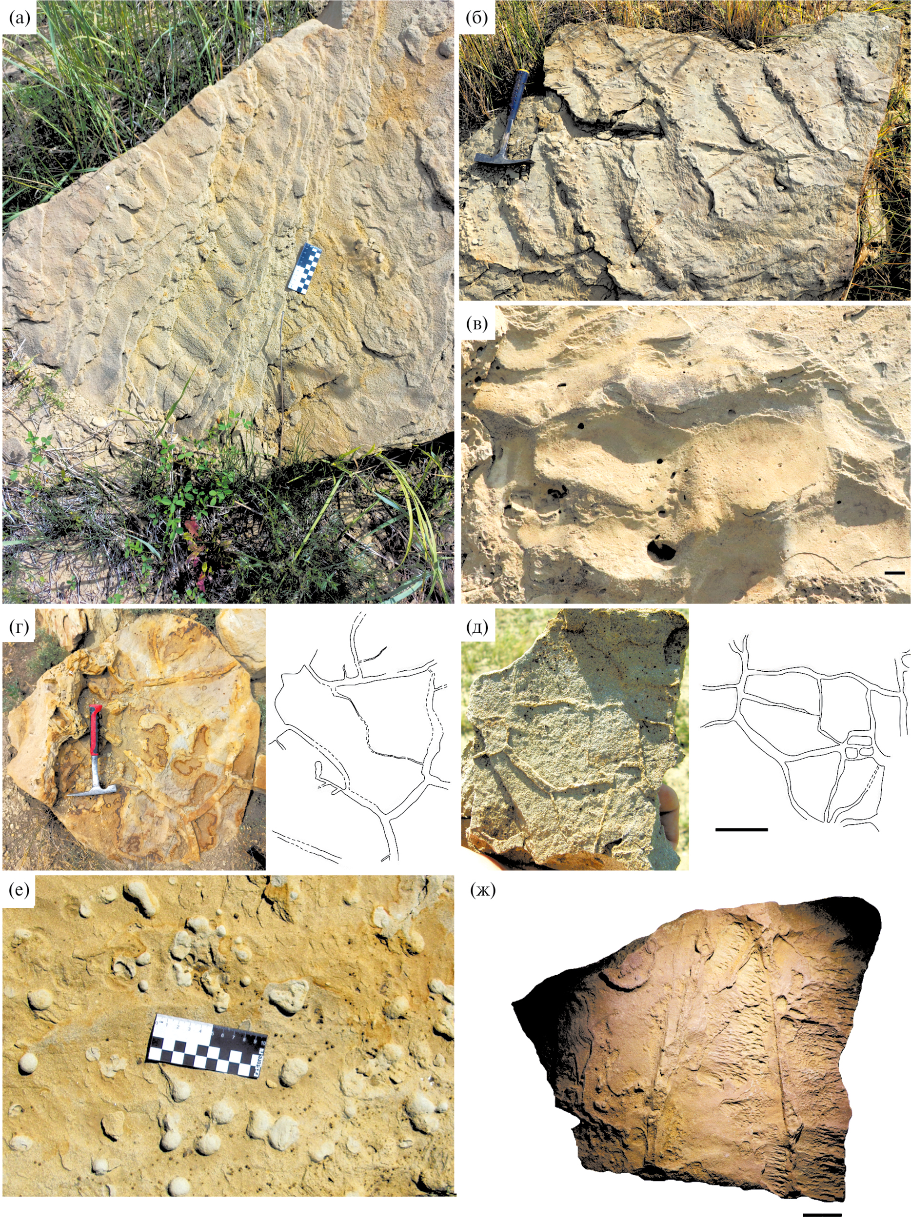Среди следов беспозвоночных обнаружены следы ползания, зарывания и питания, в том числе Taenidium isp. и другие. Наиболее многочисленны следовые дорожки артропод Diplichnites triassicus (Linck, 1943) (экз. ПИН № 5880/1, 2; рис. 10б) (Ульяхин и др., 2023а, 2023б).