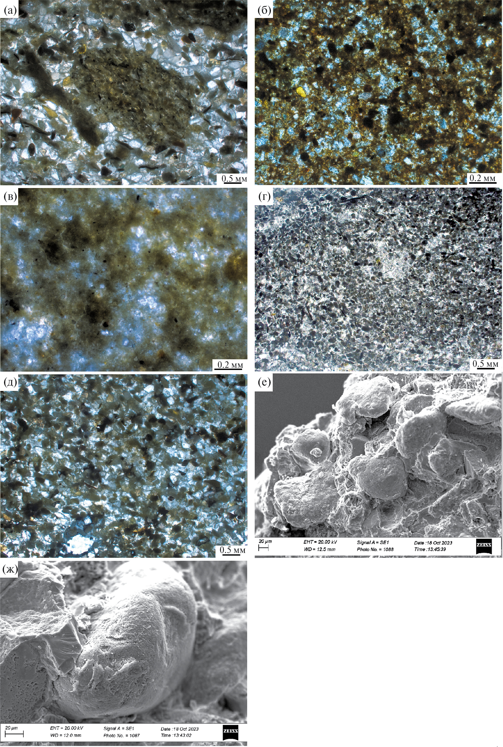 В основании глинистой пачки 4 обнаружены многочисленные остатки ризолитов не инситного залегания в виде серых и бурых кальцитовых заполнений, прямых и изогнутых, на поверхности с закономерно расположенными бугорками, круглых в поперечном сечении, местами с признаками ветвления, диаметром 2–10 мм (рис. 9в).