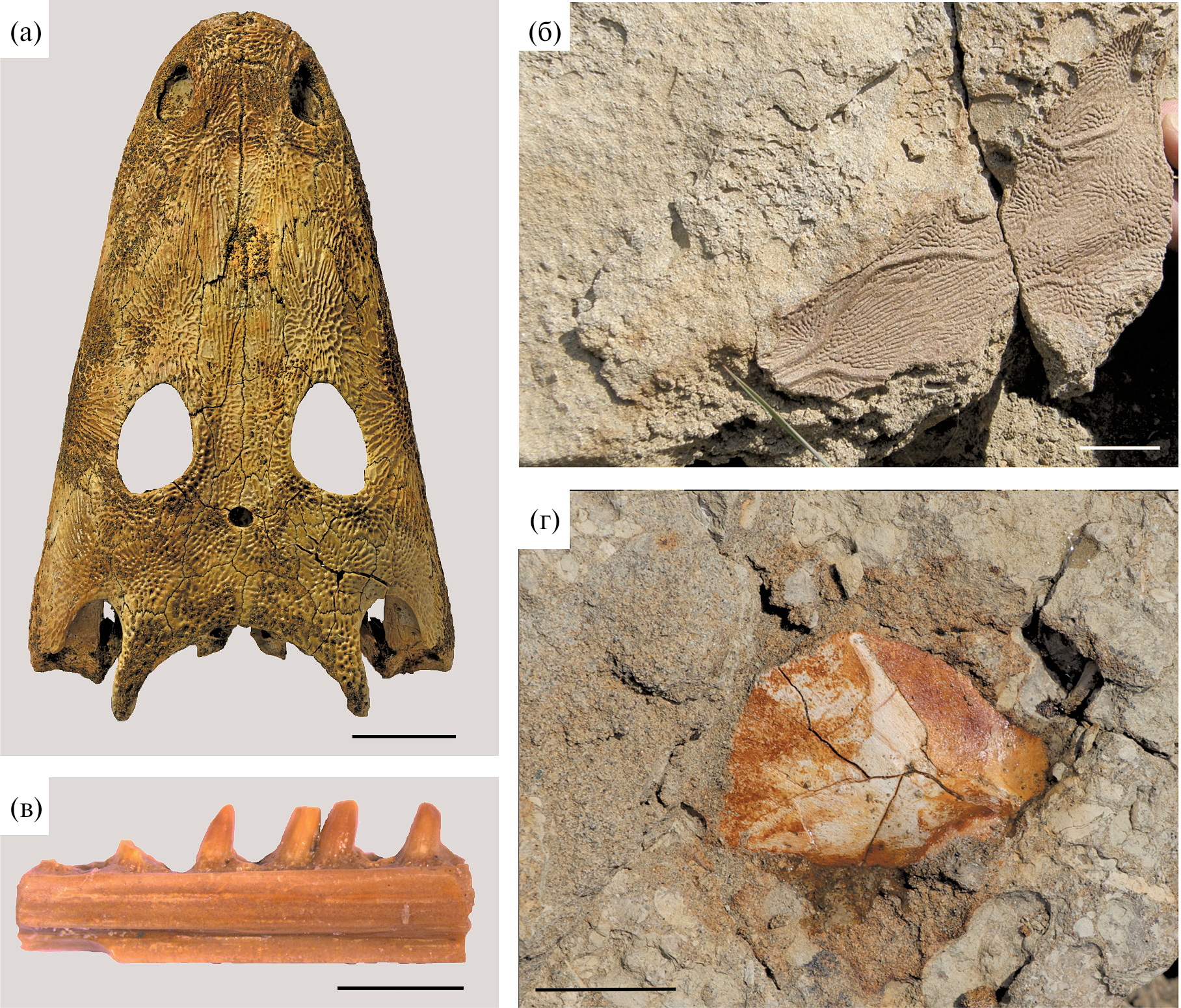 Присутствие в местонахождении трематозаврида Angusaurus sp. определено по почти полному отпечатку крыши черепа (экз. ПИН, № 5880/36; рис. 7б) и фрагменту черепа (экз. ПИН, № 5880/35), которые позволили установить степень посторбитального удлинения крыши черепа, схожего с таковым у представителей рода Angusaurus (см. Новиков, 2018).