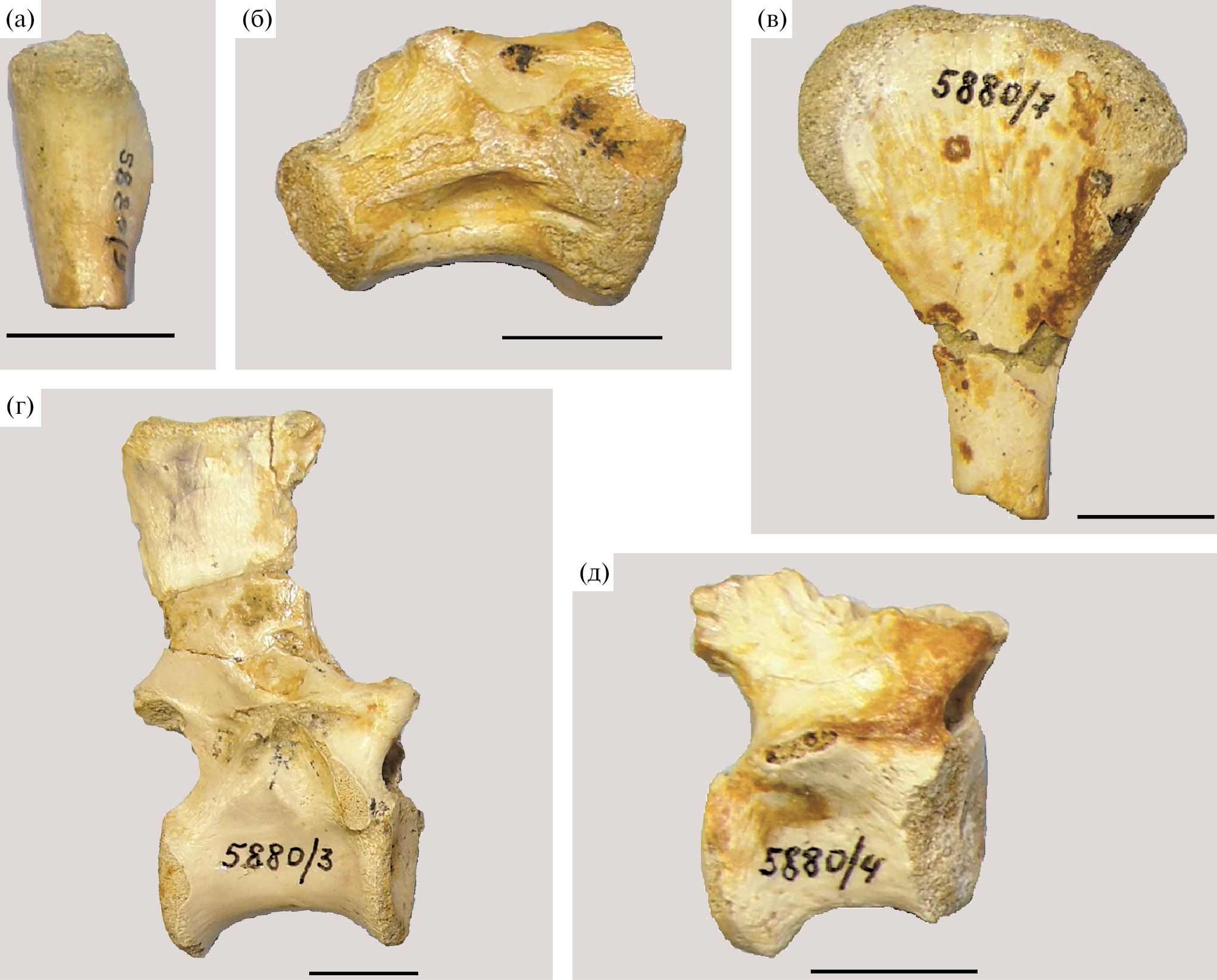 Все остатки текодонтов из местонахождения принадлежат относительно небольшим особям. Среди них достаточно уверенно диагностируется удлиненное тело среднешейного (третьего–пятого) позвонка попозавроида Tsylmosuchus, наиболее вероятно, Tsylmosuchus jakovlevi (экз. ПИН, № 5880/5) (рис. 8б). Длина тела позвонка 25 мм, высота спереди 10 мм, отношение высоты к длине 2.5. Тело позвонка сильно сжато с боков посередине. Ось тела значительно отклоняется от горизонтали. Диапофиз и парапофиз расположены довольно низко у переднего края тела позвонка. От поперечного отростка диапофиза к верхней части заднего края тела позвонка отходит задняя центродиапофизарная (постдиапофизарная) пластина. Под этой пластиной расположена глубокая центрофиапофизарная (инфрадиапофизарная) впадина. Вентральный киль в виде слабо выступающего тонкого одинарного гребня.