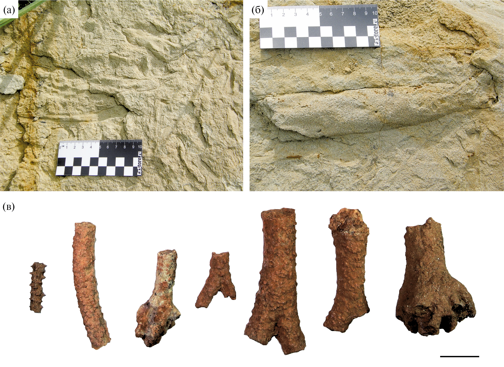 (а, б) – ядра фрагментов побегов из средней части пачки 3; (в) – ризолиты, замещенные кальцитом и песчаным материалом из низов пачки 4. Длина масштабной линейки 10 мм.