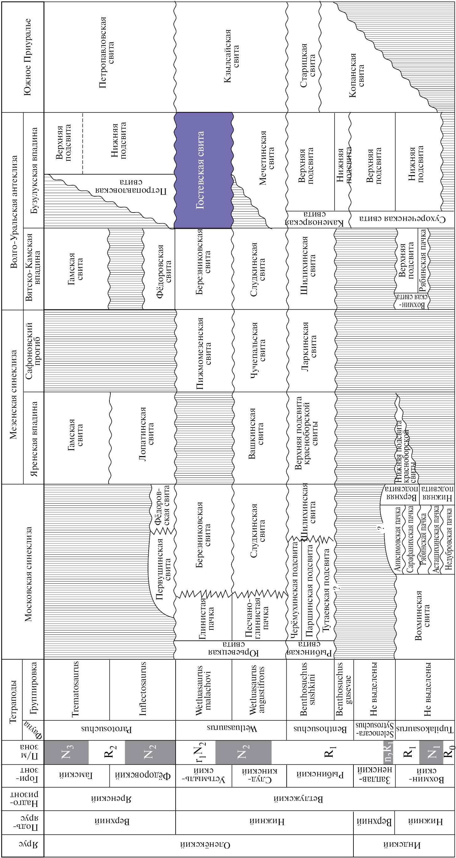 Устьмыльский горизонт, занимающий терминальное положение в составе ветлужского надгоризонта нижнего триаса Восточно-Европейской платформы (рис. 11), был впервые выделен И.В. Новиковым, В.Р. Лозовским, М.А. Шишкиным и М.Г. Минихом (Новиков и др., 1990). Он включает отложения, охарактеризованные группировкой тетрапод Wetlugasaurus malachovi фауны Wetlugasaurus, и соответствует по ихнофауне подзоне Gnathorhiza triassica beresnikiensis (Новиков, 2018). Стратотип горизонта располагается на правом берегу р. Цильма (левый приток р. Печора), в 1.5 км ниже устья р. Мыла (Новиков и др., 1990). Нижняя часть горизонта имеет прямую остаточную намагниченность (зона N2T1), тогда как его верхняя часть характеризуется обратной намагниченностью и рассматривается в качестве субзоны (rN2T1) в пределах зоны N2T1 (Лозовский и др., 2011). Раннеоленекская датировка горизонта основана на данных палинологического анализа костеносных отложений в стратотипическом разрезе (Ильина, Новиков, 1994). В пределах Восточно-Европейской платформы помимо гостевской свиты Бузулукской впадины устьмыльский горизонт представлен березниковской свитой на востоке Московской синеклизы и в Вятско-Камской впадине, глинистой пачкой юрьевецкой свиты в западной части Московской синеклизы, верхней частью вашкинской свиты Яренской впадины и пижмомезенской свитой Сафоновского прогиба в Мезенской синеклизе, а также верхней частью чаркабожской свиты в Печорской синеклизе (Новиков и др., 1990; Новиков, 1994; Лозовский и др., 2011; Кухтинов и др., 2016). Нельзя также исключать присутствие горизонта в Южном Приуралье, где ему может соответствовать верхняя часть кзылсайской свиты (Миних, Миних, 2006; Новиков, 2018).