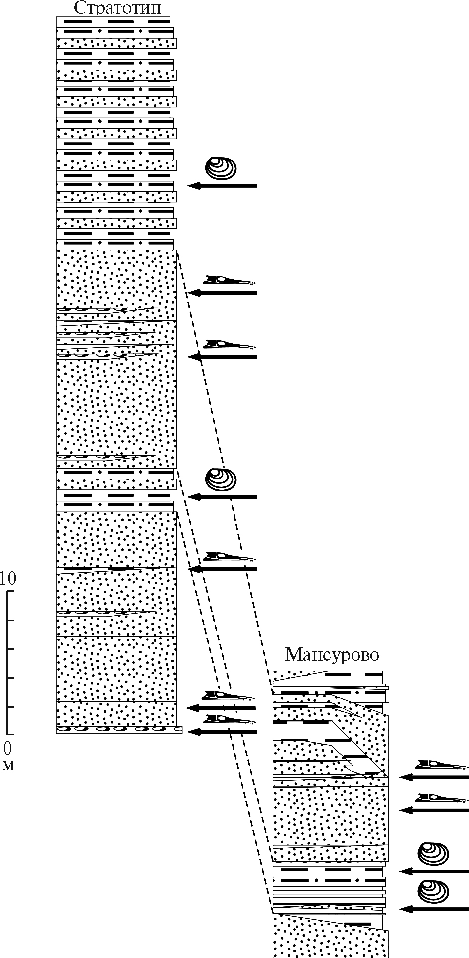 Рис. 12. Корреляция разреза Мансурово со стратотипическим разрезом гостевской свиты. Условные обозначения см. рис. 2.