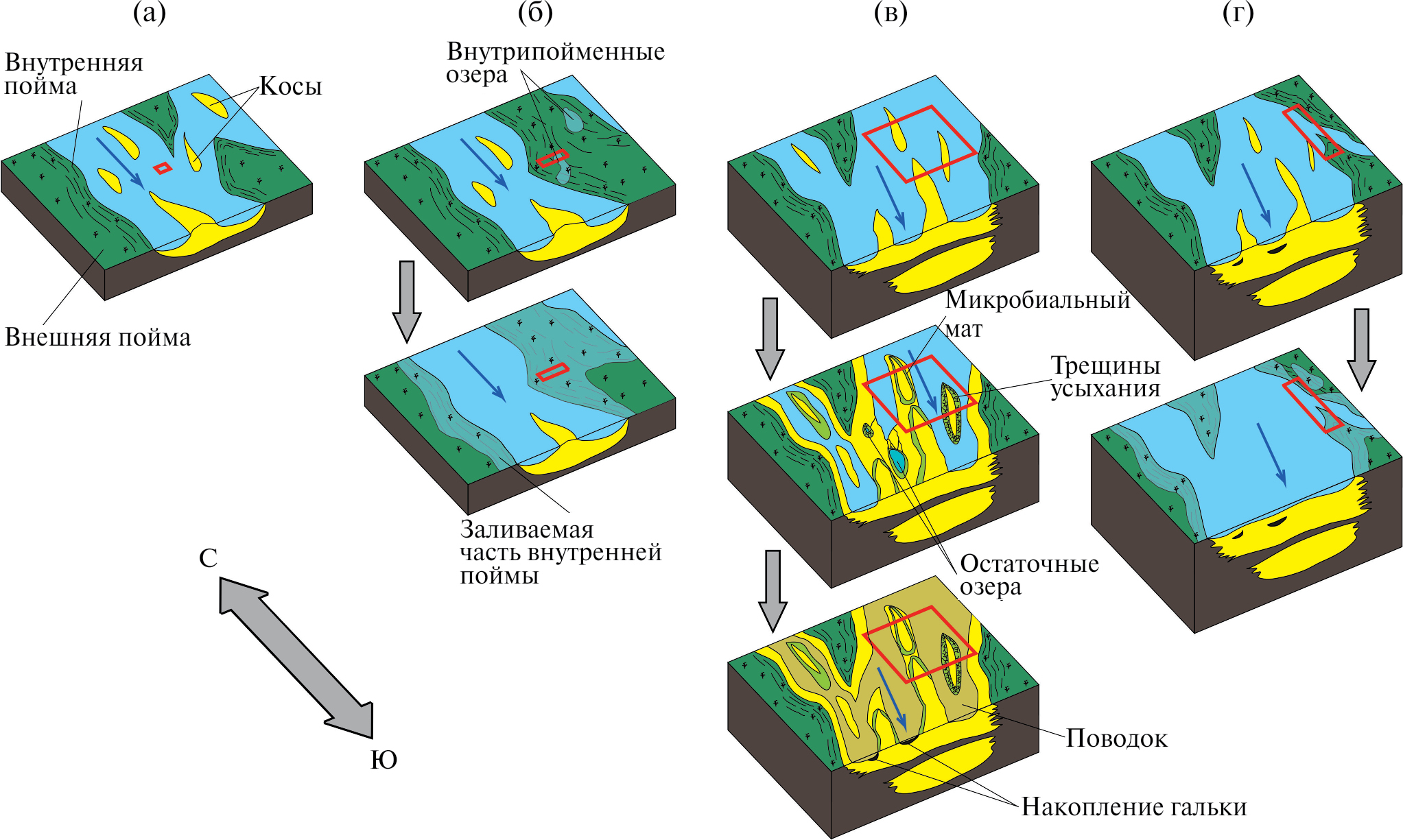 Седиментационная модель формирования местонахождения. В целом осадочные породы местонахождения Мансурово представлены флювиальной группой континентальных отложений с явной этапностью формирования осадочного комплекса (рис. 13). Их можно разделить на четыре седиментационных цикла, соответствующих выделенным пачкам (снизу вверх):