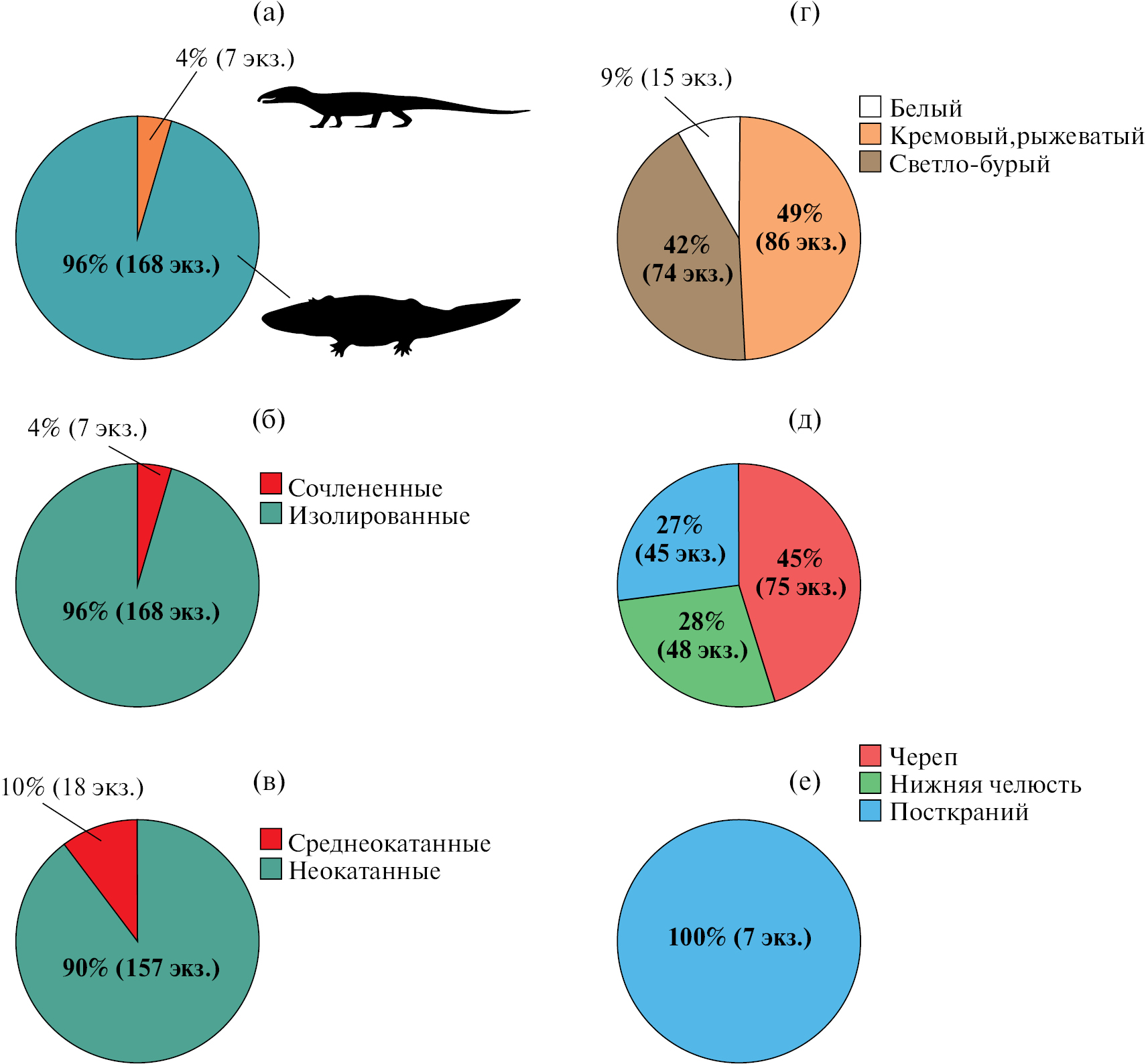 (а) – соотношение остатков Temnospondyli и Archosauromorpha; (б) – соотношение изолированных и сочлененных остатков; (в) – соотношение неокатанных и среднеокатанных остатков; (г) – соотношение остатков по их цветам; (д) – соотношение черепных, нижнечелюстных и посткраниальных элементов скелета для Temnospondyli; (е) – посткраниальные элементы скелета для Archosauromorpha.