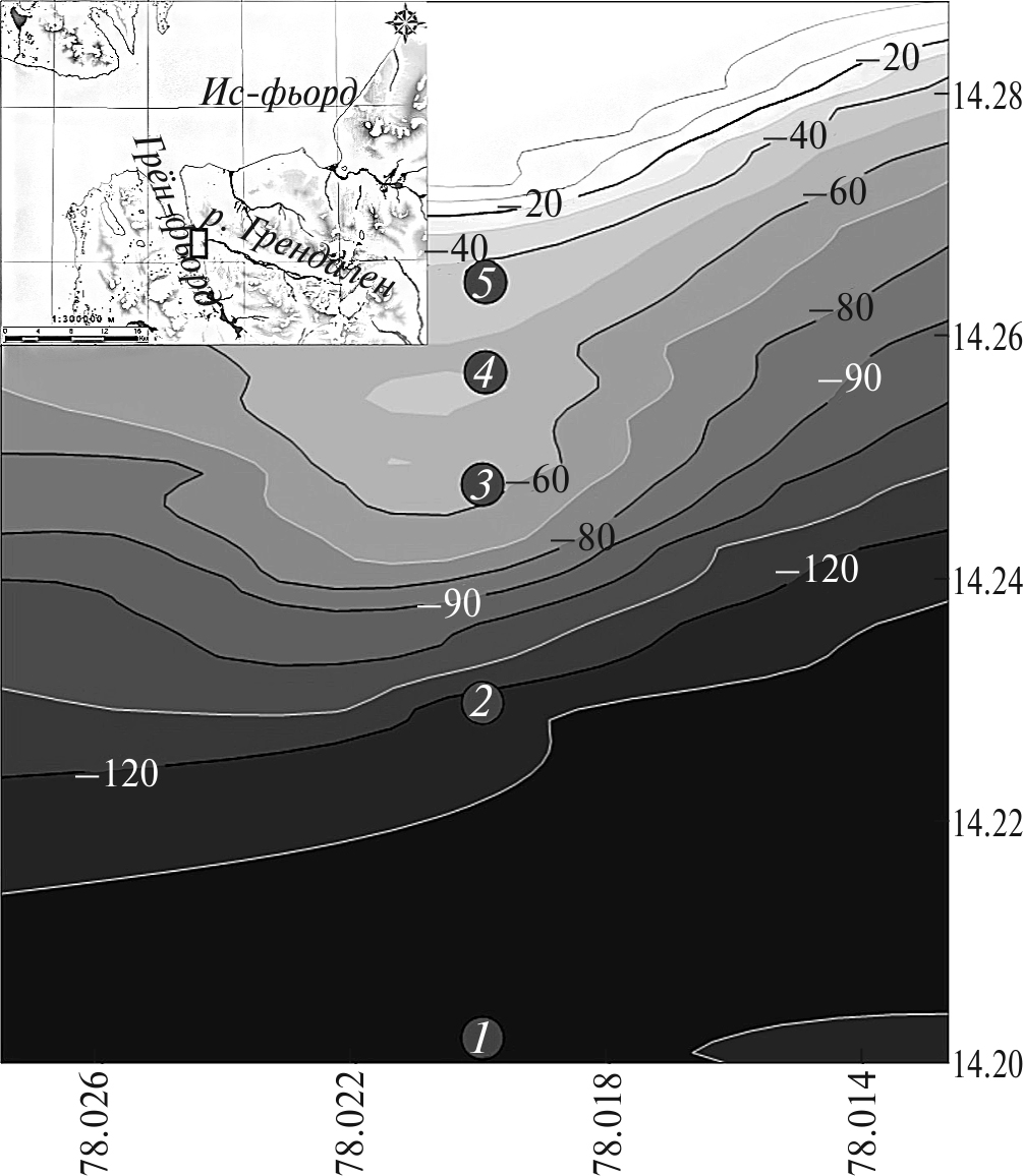 В данном аспекте выделяется устьевое взморье р. Грёндален (Гохман, 1988), которое питается интенсивно деградирующими ледниками Тавле и Тунге (Мавлюдов, 2004, 2007; Мавлюдов и др., 2012) и впадает в залив Грён-фьорд (о. Западный Шпицберген). Высокая скорость осадконакопления, обусловленная близостью флювиогляциальных потоков (Тарасов и др., 2000; Zajączkowski et al., 2004; Zaborska et al., 2006), дает основание предполагать, что даже незначительные и короткопериодные флуктуации климатообразующих факторов отобразятся в стратиграфии донных отложений (Meshcheryakov et al., 2021; Meshcheriakov et al., 2023). Гидрометеорологические наблюдения в регионе ведутся с середины прошлого века Федеральной службой по гидрометеорологии и мониторингу окружающей среды (Росгидромет) и метеорологической службой Норвегии. Цель настоящей работы – на основе данных метеорологических наблюдений и стратиграфии донных отложений оценить влияние климатообразующих факторов на последовательность смены литотипа и скорости осадконакопления в районе устьевого взморья р. Грёндален залива Грён-фьорд. Стратиграфический анализ слоев осадочных отложений, сформировавшихся в период климатических изменений, выполняли с помощью метода радиоизотопного датирования по 210Pb, который позволяет определить возраст во временном масштабе 100–150 лет (Robbins, 1978; Appleby, 1986; von Gunten, Moser, 1993). Для исключения сомнительных или неточных интерпретаций профилей 210Pb хронологию подтверждают независимыми временными маркерами (например, 137Cs) или другими доступными геохимическими индикаторами (Sanchez-Cabeza, Ruiz-Fernández, 2012; Русаков и др., 2019; Schirone et al., 2022).
