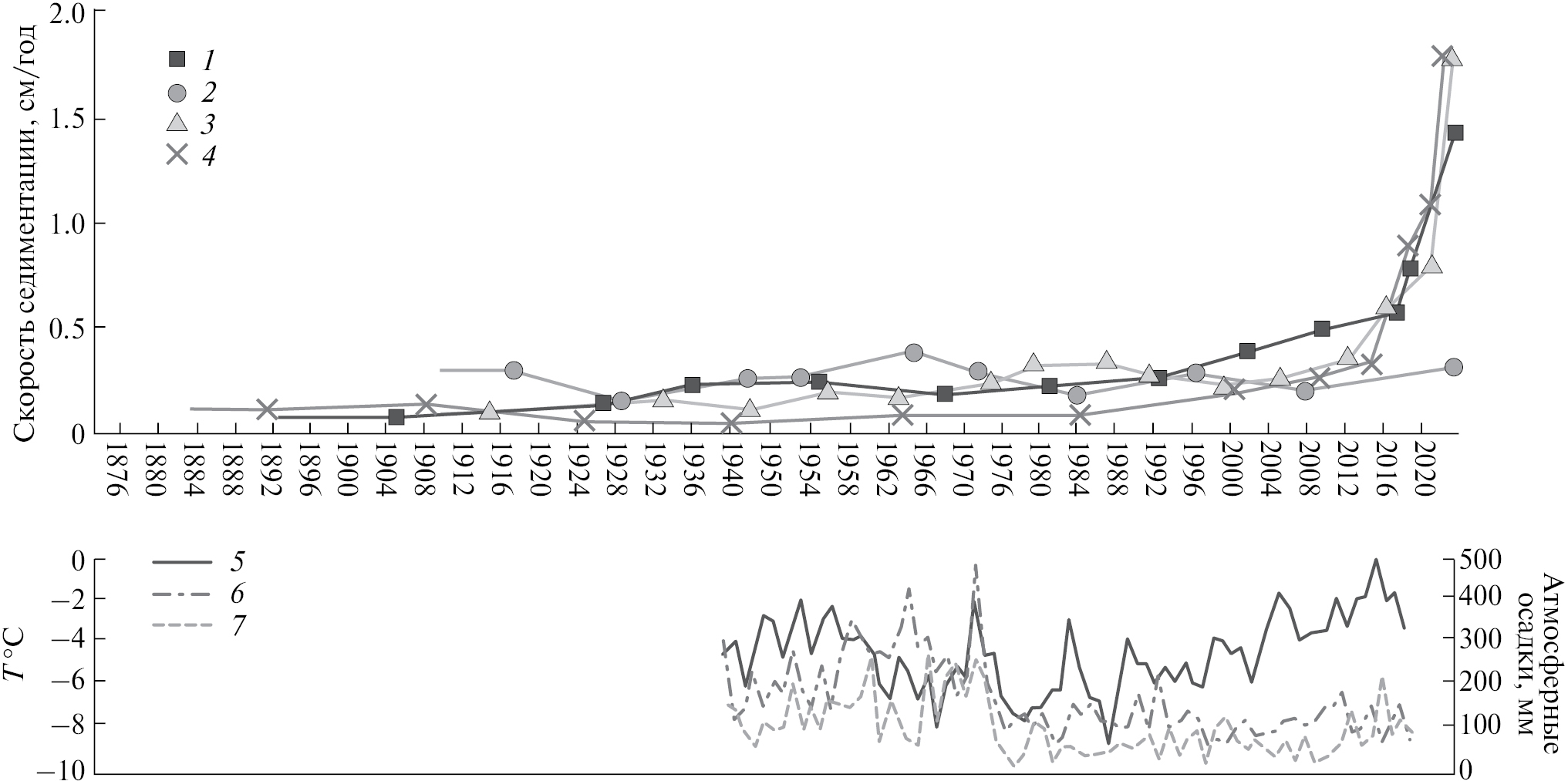 Рис. 4. Многолетняя динамика изменения скорости седиментации и климатических компонентов в кернах 2–5. 1 – керн 2; 2 – керн 3; 3 – керн 4; 4 – керн 5; 5 – среднегодовая температура; 6 – среднегодовое количество жидких атмосферных осадков; 7 – среднегодовое твердых осадков.