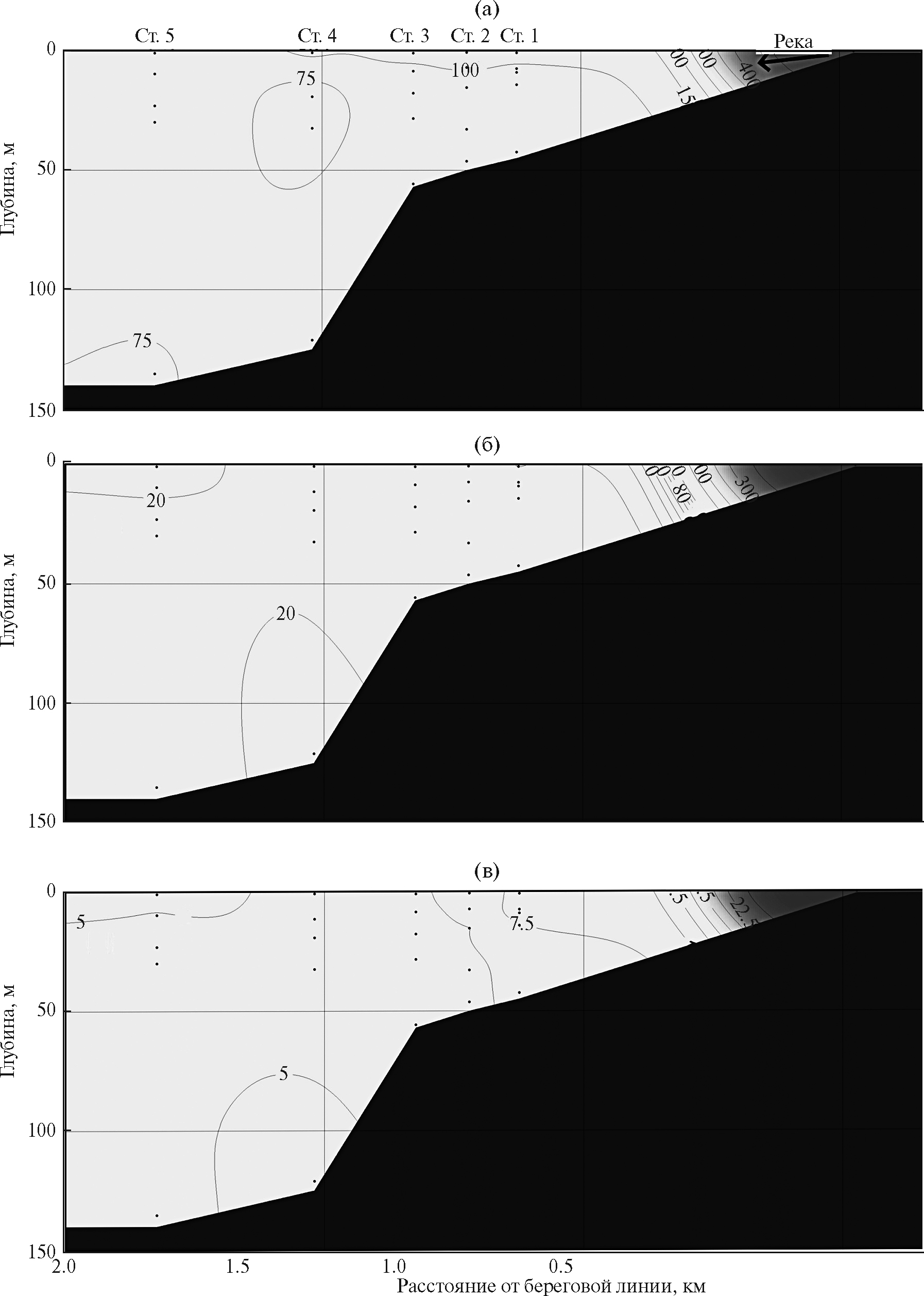 Наибольшее содержание локального речного стока (fr) обнаружено в точке 1 и 2 в зоне лавинной разгрузки осадочного материала (9–11%). Максимальный вертикальный градиент изменения величины fr наблюдался в слое 5–7 м, ниже этого слоя fr варьировало в пределах 1–4%. Уменьшение fr от градиентной зоны к оси залива (от точки 1 к точке 5, рис. 1) в среднем составляло 0.2% на 100 м, и на расстоянии 1.6 км от уреза воды величина fr составляла 6–8%. Максимальный горизонтальный градиент изменения этой величины прослеживается на расстоянии 400–600 м от устья реки. На этом расстоянии содержание речного стока локального происхождения уменьшалось от 100 до 11%, а величина солености увеличилась от 0 до 31 епс.