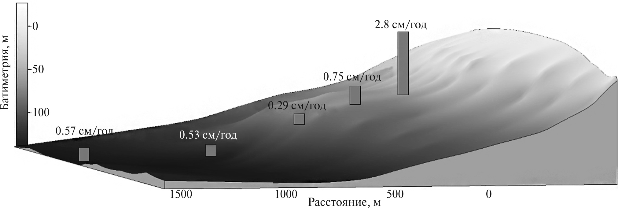 Максимальные темпы седиментации отмечены в точке 1 на расстоянии 200 м от уреза воды, где проходит граница гидрохимического и термохалинного градиента между речными и морскими водами. Средняя скорость осадконакопления составляет 2.8 см/год. Донные осадки в датируемом периоде (2006–2022 г.) представлены в равной мере алевритом и пелитом.