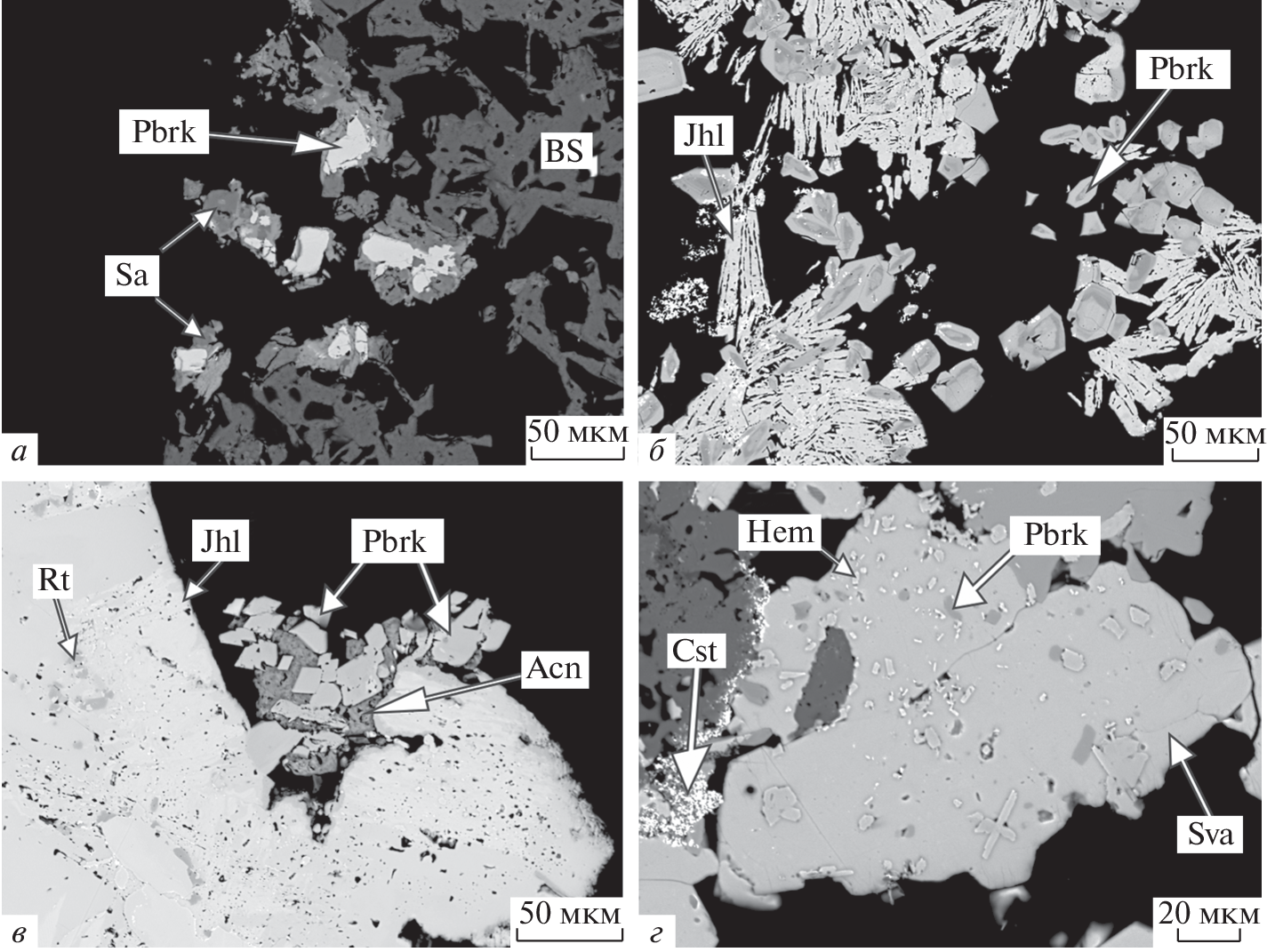 For the first time there is characterized pseudobrookite from deposits of active volcanic fumaroles Arsenatnaya and Yadovitaya of the Tolbachik volcanic massif (Kamchatka). Chemical composition of pseudobrookite-group minerals and isomorphism in these oxides of different origin were studied on the base of 203 analyses (literature data and original analyses of 40 samples) from 44 localities. It is shown that at the near-surface levels pseudobrookite crystallized mainly with composition chemically close to the end-member Fe\(_{2}^{{3 + }}\)TiO5. It is known that lunar rocks contain only minerals of the “ferropseudobrookite” Fe2+Ti2O5 ‒ armalcolite MgTi2O5 series characterized by an intermediate value of the Fe2+:Mg-ratio, the highest Ti content and the absence of Fe3+. Impact minerals and there technogenic analogues are chemically close to Fe2+Ti2O5. Pseudobrookite from Tolbachik fumaroles is characterized by the high Al content (up to 7.1 wt % Al2O3), a stable level of Cu (up to 1.8 wt % CuO) and Sn (up to 1.8 wt % SnO2) admixtures, and, sporadically by the small admixture of Sc (up to 0.3 wt % Sc2O3). Cu and Sn admixtures are indicative features of the pseudobrookite of this genetic type. These elements usually are incorporated into pseudobrookite together, according to the isomorphic scheme Sn4+ + Cu2+ → 2Fe3+, which is revealed for the first time for minerals of this group. Pseudobrookite of Tolbachik fumaroles was formed participating the process of gas–metasomatic alteration of basalt at temperature 500–750 °С. Presumably, Cu and Sn were brought by volcanic gas, while basalt was a source of Ti, Al and Sc; for Fe a source could be mixed.