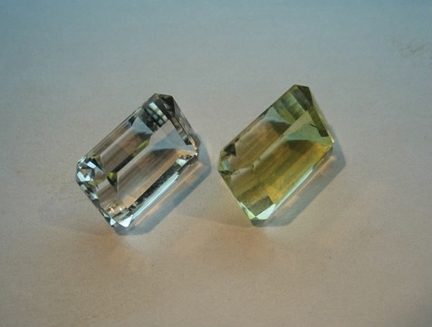 Objects of the study were colorless single crystals of quartz with a total amount of impurities lesser than 1%. Implantation of vanadium ions into the quartz structure was carried out parallel to the symmetry axis C. Irradiation doses varied from 0.75 × 1017 to 1.5 × 1017 ion/cm2. With the purpose to anneal radiation defects and to redistribute the implanted vanadium admixture, the post-implanting heat treatment was carried out in the air atmosphere, within the range 200–1000 °C. There was solved issue of ion-beam modification of the colorimetric properties of the quartz matrix with simultaneous control of change in the nature of color of the piezo quartz raw material. In result of the study, samples with annealing temperatures of 383 and 585 °C were investigated most thoroughly by methods of adsorption optical spectroscopy. The quartz sample with annealing temperature 383 °C has acquired an olive-green color due to formation of oxide nanoprecipitates of vanadium ions with different valences: V2+, V3+, V4+. The quartz sample with annealing temperature 585 °C become discolored in result of oxidation of vanadium ions and their transition in the pentavalent state V5+.