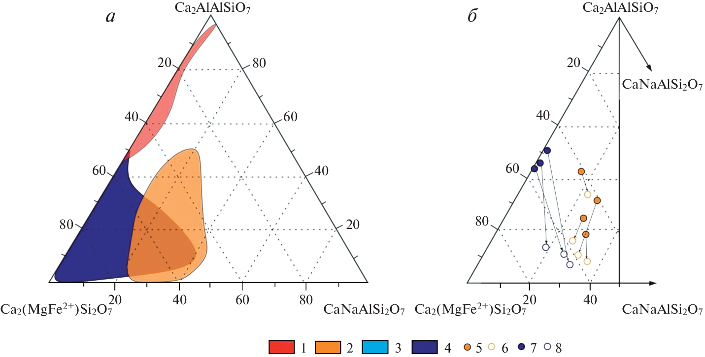 Paralavas of combustion metamorphic complexes in Mongolia were formed in high-temperature conditions from carbonate-terrigenous rocks of sedimentary formations due to to multistage spontaneous underground coal fires. Melilite-nepheline paralavas contain phenocrysts of Fe-rich åkermanite-alumoåkermanite, clinopyroxene of the diopside–hedenbergite series containing up to 49 mol. % of kushiorite end-member, and basic plagioclase. Enstatite-ferrosilite is the rock-forming mineral in paralavas of the plagioclase-pyroxene ± ± indialite composition. Paralavas often contain xenoliths of thermally altered sedimentary rocks. Mineral associations in remnant xenoliths of marly limestone are composed of gehlenite, minerals of the monticellite–kirschsteinite series, perovskite, Al-rich clinopyroxene, spinel, and other minerals. They were formed both at the stage of the high-temperature metamorphism of sedimentary protolite, preceding the melting of carbonate-silicate rocks, and as a result of the reactionary interaction between xenoliths and pyrogenic silicate melts of different composition.