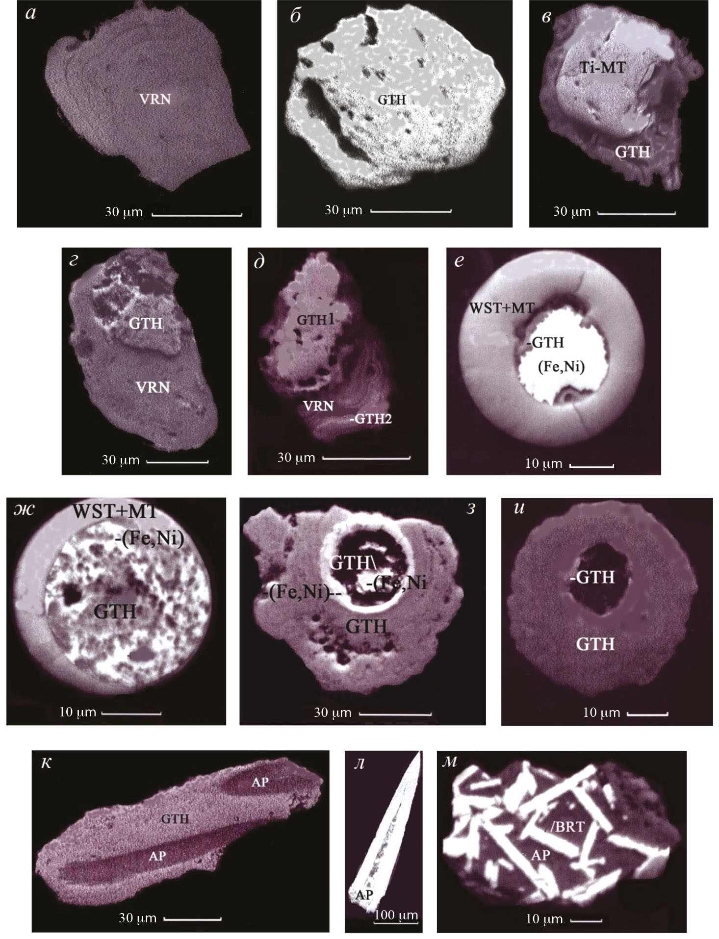 Исключительно информативными для реконструкции процессов минералооб- разования в ЖМК и базальтах подложки являются зональные полиминеральные зерна-микроглобулы (рис. 4, д–з). Это округлые частицы диаметром 20–100 мкм. Ядро этих образований – «микрокапля» самородного железа (20–70 мкм, степень сферичности до 100%). Вокруг Fe-ядра всегда присутствует оторочка (толщиной 2–10 мкм), сложенная тонкозернистым агрегатом вюстита и магнетита. В HS-концентрате обнаружена также вюстит-магнетовая «микрокапля» с классической тонкозернистой структурой распада твердого раствора (рис. 4, и). Многие зональные частицы имеют каймы гётита и более позднего по отношению к гётиту вернадита (рис. 4, ж, з).