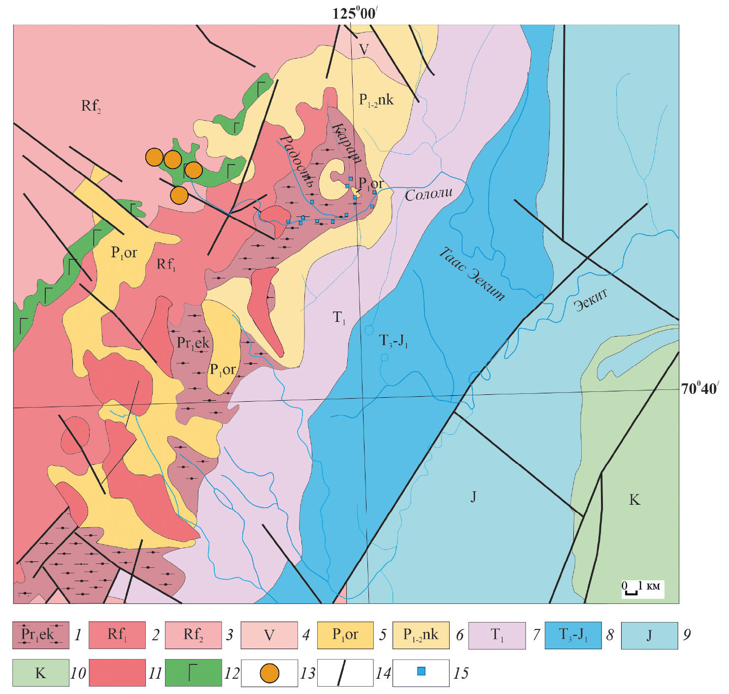 1 – rocks of the Early Proterozoic Eekite series; 2 – Early Riphean sandstones, siltstones, gritstones, and conglomerates; 3 – Middle Riphean sandstones, dolomites, and limestones; 4 – Vendian sandstones, conglomerates, dolomites, and limestones; 5 – conglomerates, gravelites, sandstones, carbonaceous shales, siltstones of the Early Permian Orthokinskaya formation; 6 – interbedding of patches of mudstones, siltstones, and sandstones of the Late Permian Nykabytskaya formation; 7 – Triassic mudstones, siltstones, and tuffaceous sandstones; 8 – Late Triassic – Early Jurassic conglomerates, sandstones, siltstones; 9 – Jurassic sandstones, conglomerates, interlayers of mudstones and siltstones, with lenses of limestones; 10 – Cretaceous sandstones, siltstones, interlayers and lenses of conglomerates; 11 – Early Proterozoic granitoids; 12 – Early Riphean dolerites of Uettyakhsky complex; 13 – Vendian trachybasalt-trachyte Mongusky complex; 14 – faults; 15 – points of the lump sampling.