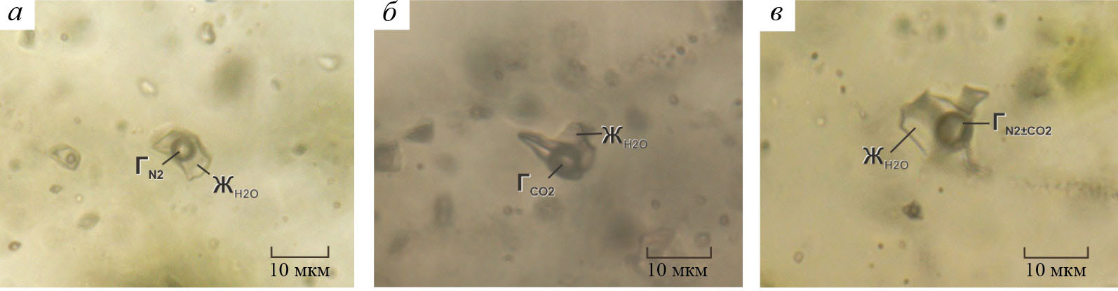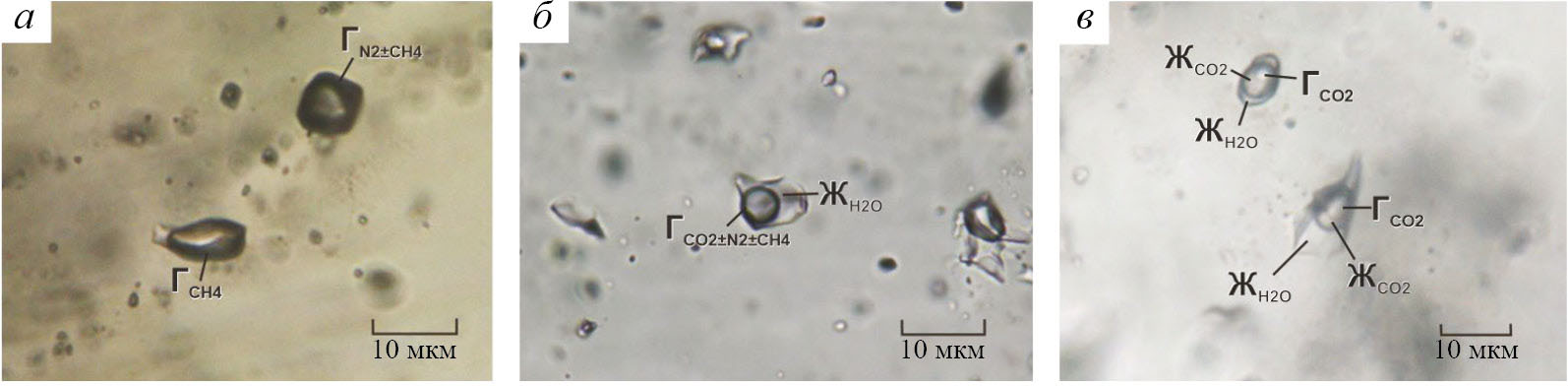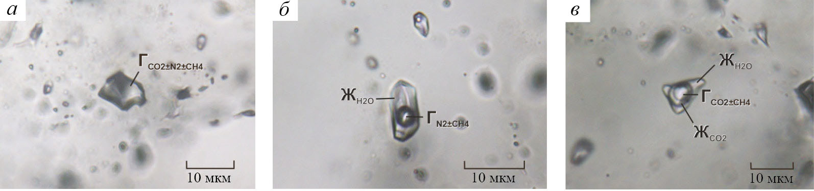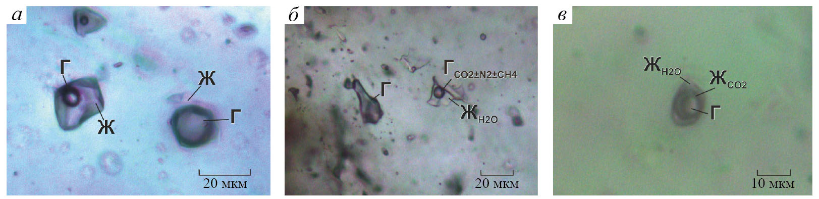 В кварце из кварцевой гальки с самородным золотом россыпи р. Сололи обнаружены первичные включения размером от 10 до 35 мкм, которые имеют вытянутую, неправильную и угловатую форму. По фазовому составу при комнатной температуре среди первичных ФВ встречаются три типа: 1) существенно газовые – однофазные (рис. 9, б); 2) газово-жидкие – двухфазные с объемом газового пузырька 10‒20 об.% (рис. 9, а, б); 3) водно-углекислотные – трехфазные с соотношением углекислотной (газовой или плотной жидкой СО2) и водной фаз 80:20 об.% (рис. 9, в).