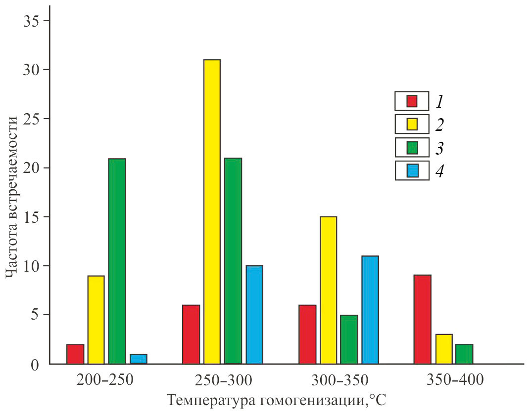 Fig. 4. Histogram of distribution of the homogenization temperature for fluid inclusions in quartz from veins in different rocks and in an intergrowth quartz and gold, Sololi Uplift area.