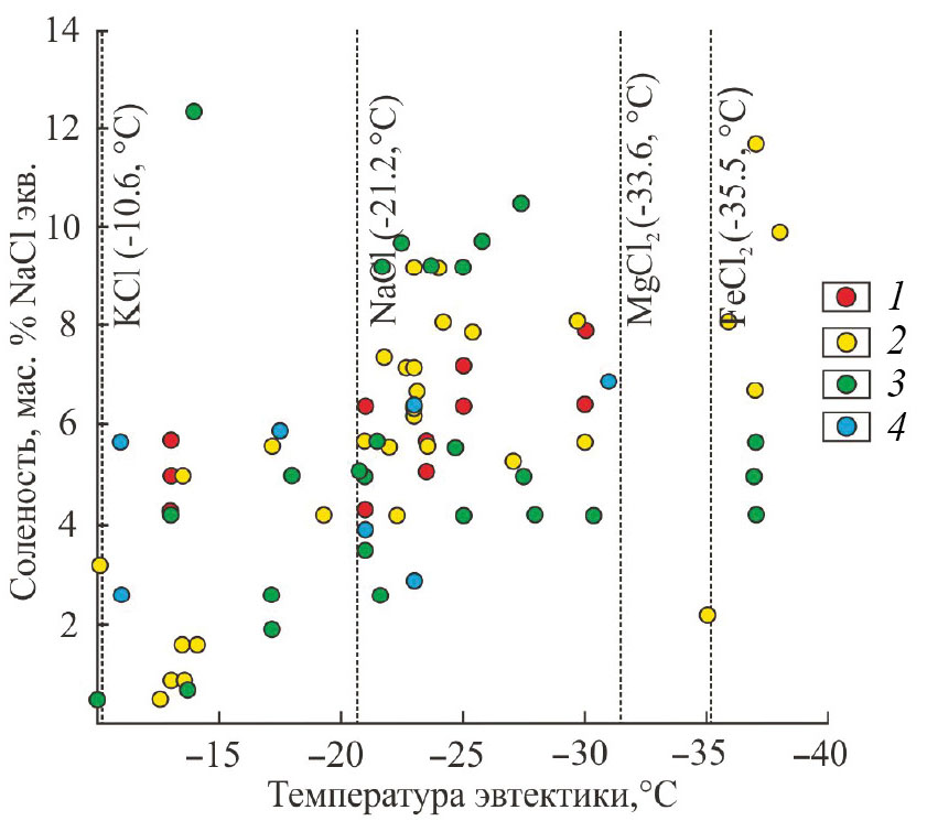 Рис. 5. Соотношение температуры эвтектики и солености флюидных включений в кварцевых жилах и в золотокварцевом сростке Сололийского поднятия. Диаграмма построена с использованием данных (Бхаттачарайа, Паниграйи, 2011).