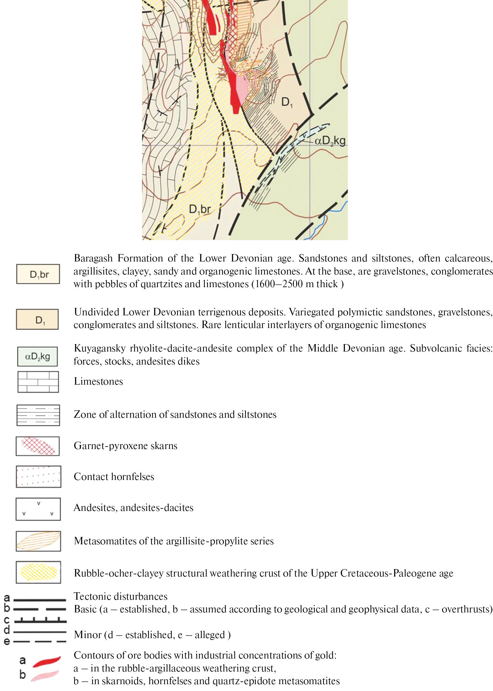 Рис. 1. Геологическая схема Мурзинского месторождения (по данным статьи: Мурзин и др. (2015), с изменениями). Поле зрения: 1.4 × 1.7 км.