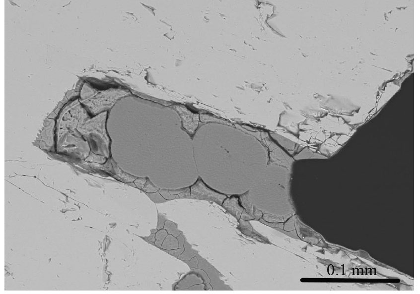 Рис. 4. Сферолиты ледневита (серые) в филипсбергите (светло-серый). Аншлиф. Фото в отраженных электронах.