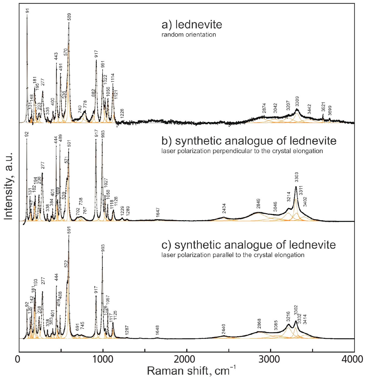 Raman spectra of lednevite and its synthetic analogue are very similar, however, natural material shows significantly stronger luminescence. It is not seen in the Fig. 6, as it shows background-subtracted spectra, however it resulted in lower signal-to-noise ratio in the natu- ral sample. Intensities of individual Raman bands can mutually differ among the 3 recorded spectra, such variation is caused by different crystal orientation with respect to the laser polarization (cf. Figs. 6b,c).