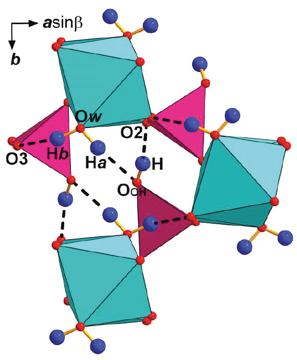 The crystal structure of the synthetic analogue of lednevite was solved from SCXRD data and refined with the use of SHELX software package (Sheldrick, 2015) to R1 = 0.0173 for 1159 independent reflections with I > 2σ(I). All positions of H atoms were determined through the difference Fourier synthesis and O-H distances were softly restrained to be 0.85(1) Å. Coordinates and displacement parameters of atoms for lednevite and its synthetic analogue are given in Table 4 and selected interatomic distances including the system of hydrogen bonds for the synthetic analogue of lednevite in Table 5. Lednevite is isotypic with synthetic CuHPO4·H2O (Boudjada, 1980; our data). Its crystal structure is based on the heteropolyhedral pseudoframework built by PO4 tetrahedra and CuO4(H2O)2 octahedra distorted by the Jahn-Teller effect (Figs 8 a, b). Cu-centred octahedra share edges to form chains along c axis. Neighbouring chains are connected via (P,As)O3(OH) tetrahedra for- ming the heteropolyhedral pseudoframework. Minor As impurity was added to the P site in natural sample according to chemical composition data. The system of H-bonds is shown at Fig. 9.