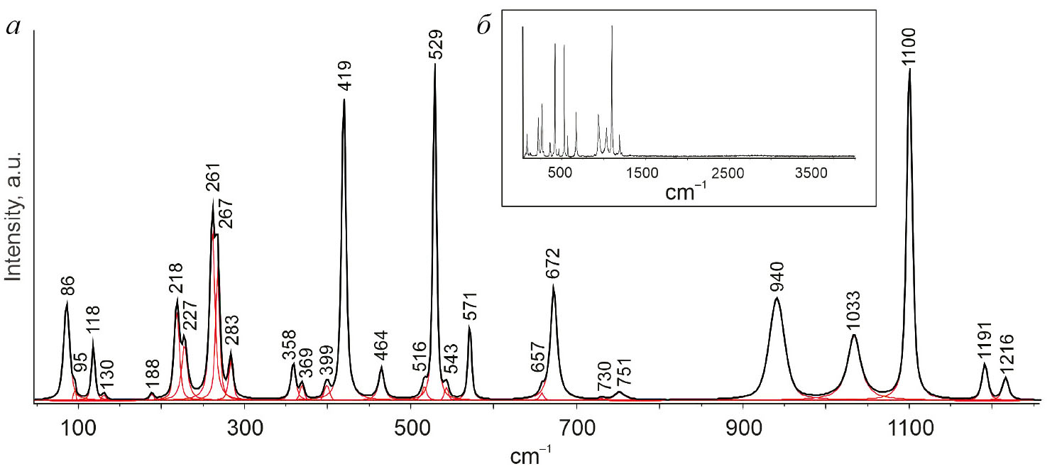 Рис. 2. Рамановский спектр BaBPO5 в диапазоне 80–1280 см-1 (a) и во всем диапазоне съемки (б).