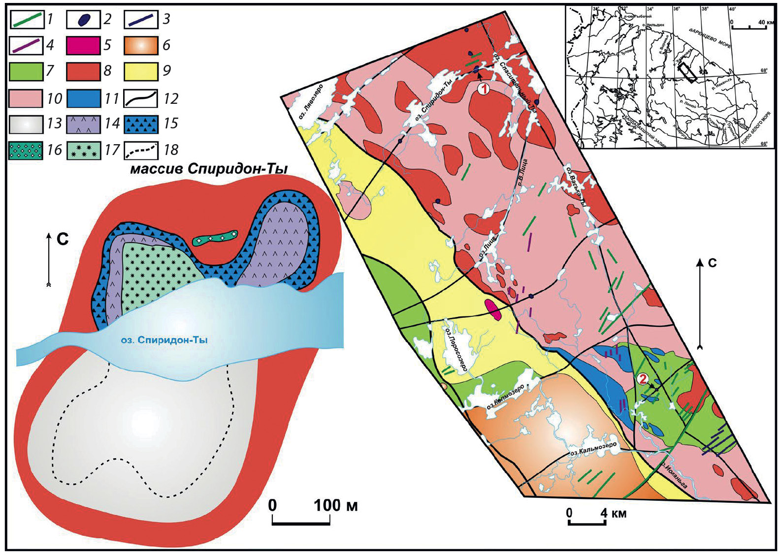 Схема положения интрузий перидотит–шонкинитовой серии. Палеозой: 1 — дайки оливиновых долеритов; мезопротерозой: 2 — интрузии перидотит-шонкинитовой формации (1 — Спиридон–Ты, 2 — Эльвань); палеопротерозой: 3 — дайки перидотитов-клинопироксенитов, 4 — дайки габбро-норитов; поздний архей: 5 — лицевский комплекс турмалин-мусковитовых гранитов, 6 — щелочные граниты Западно-Кейвского массива, 7 — поросозерско-колмозерский габбро-гранитный комплекс, 8 — массивы мигматит-гранитов, 9 — метаморфогенный комплекс Колмозеро-Воронья, выполняющий зону Титовско-Кейвского глубинного разлома, 10 — гранитоиды ТТГ формации, 11 — пироксениты и габбро-лабрадориты колмозерско-кейвского габбро-анортозитового комплекса; 12 — наиболее крупные разломы. Схематическая карта массива Спиридон-Ты. 13 — четвертичные отложении, 14 — флогопитовые перидотиты, 15 — флогопитовые клинопироксениты, 16 — шонкиниты, 17 — эруптивная брекчия перидотитов и клинопироксенитов с шонкинитовым цементом, 18 — границы интрузии по данным магниторазведки.