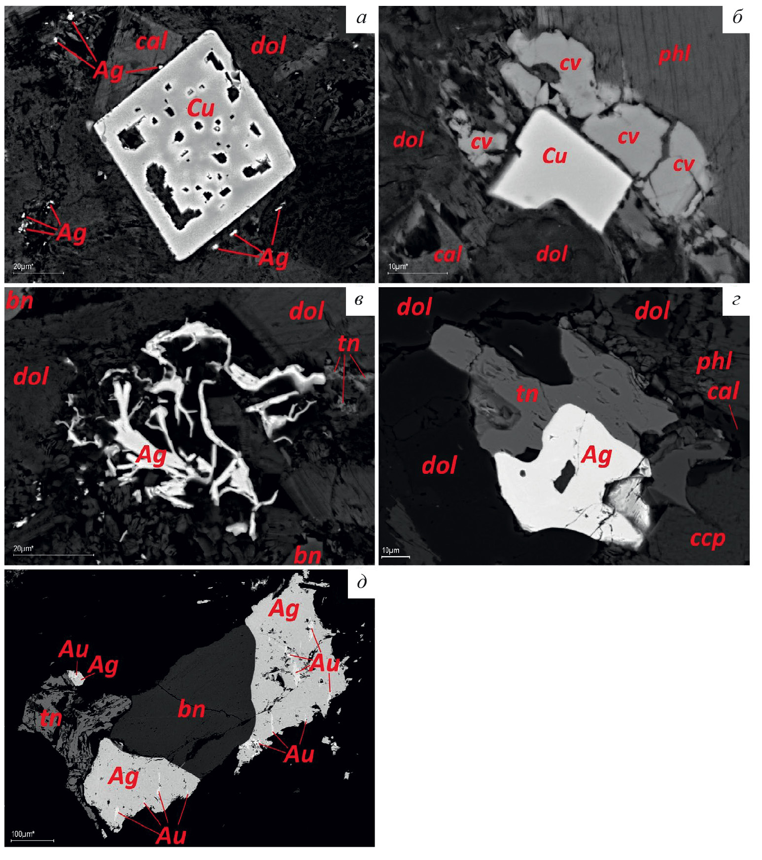 bn — борнит, cv — ковеллин, tn — теннантит, Cu — самородная медь, Ag — самородное серебро, Au — самородное золото, phl — флогопит, cpx — клинопироксен, dol — доломит, cal — кальцит. Изображения в обратно-отраженных электронах.