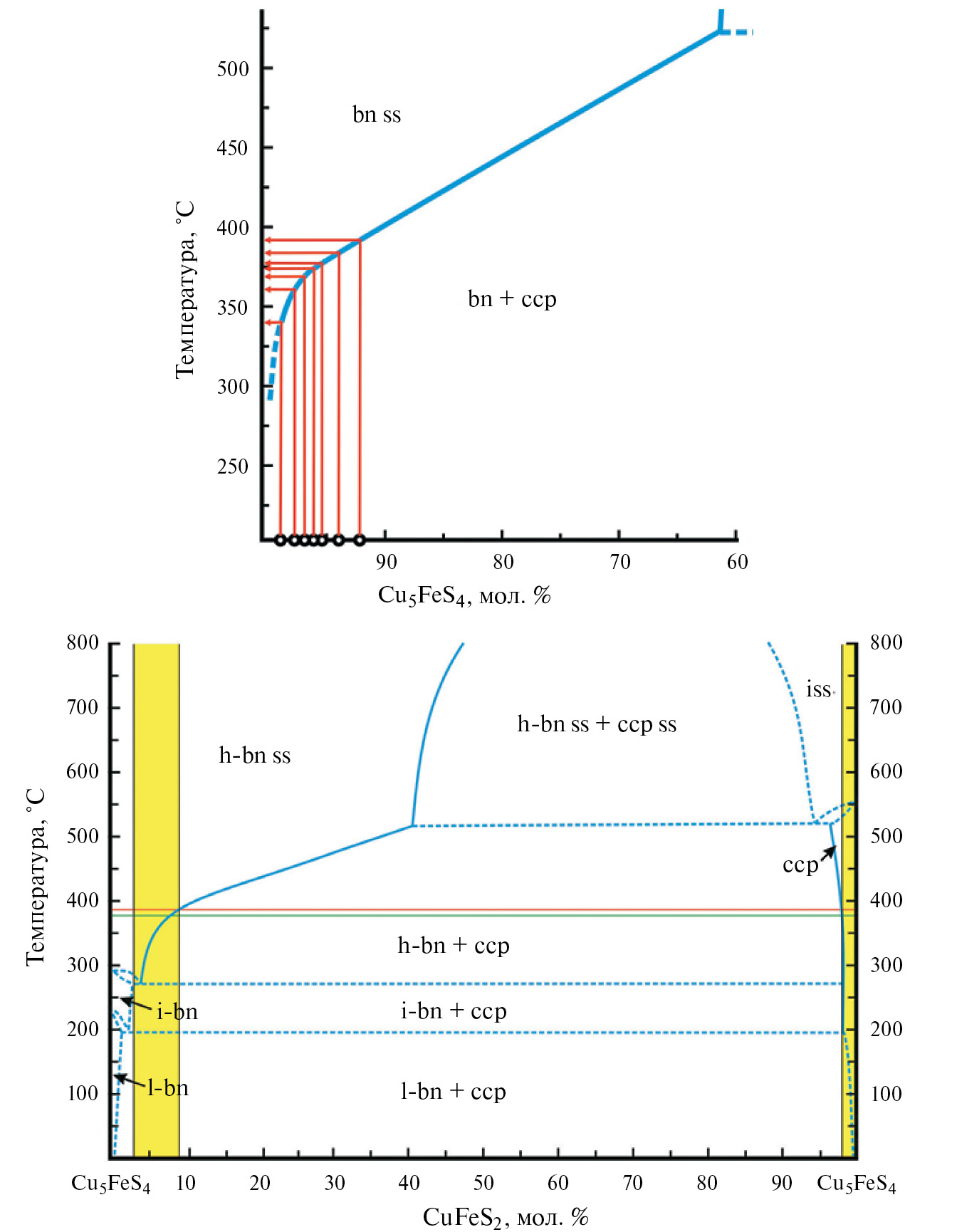 bn — борнит, h-bn — высокотемпературный борнит, i-bn — промежуточный борнит, l-bn — низкотемпературный борнит, ccp — халькопирит, ss — твердый раствор, iss — промежуточный твердый раствор. На диаграмме 4, б красной линией обозначен верхний предел температуры кристаллизации изученного борнита (395 °C); зеленой линией — верхний предел температуры кристаллизации изученного халькопирита (380 °C); желтым цветом закрашены поля составов борнита и халькопирита Спиридон-Ты.