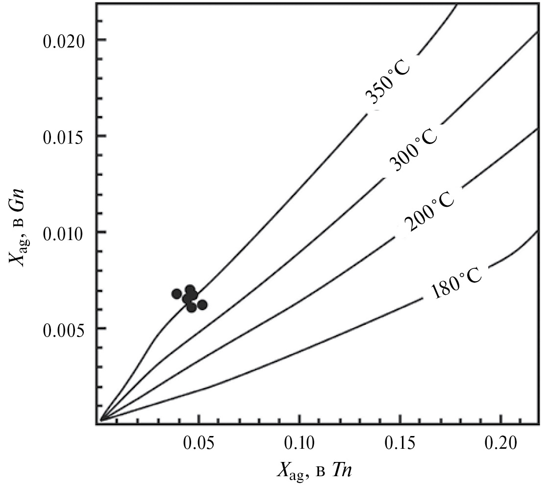 Оценить температуры по сфалерит–галенит–блекло-рудному геотермометру можно по распределению серебра между блеклой рудой (XAg = Ag/(Ag+Cu) мол.%) и галените (XAg = AgSbS2/(AgSbS2+PbS) мол.%). Поскольку содержание сурьмы в галените Спиридон-Ты не определялось, с учетом результатов исследований Р. Сака было сделано предположение, что в галените Спиридон-Ты серебро присутствует в виде кубоаргирита. Исходя из этого предположения, на диаграмму XAg в галените — XAg в теннантите были нанесены точки сосуществующих галенита и теннантита (рис. 5) и показан, что кристаллизация галенит-теннатитового парагенезиса могла происходить в температурном интервале 330—370 °C.
