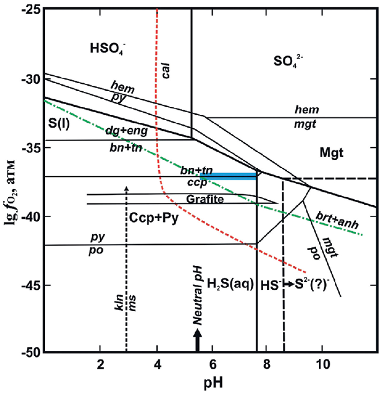 bn — bornite, tn — tennantite, ccp — chalcopyrite, py — pyrite, po — pyrrhotite, dg — digenite, eng — enargite, mgt — magnetite, hem — hematite, cal — calcite, brt — barite, anh — anhydrite, kln — kaolin, ms — muscovite.