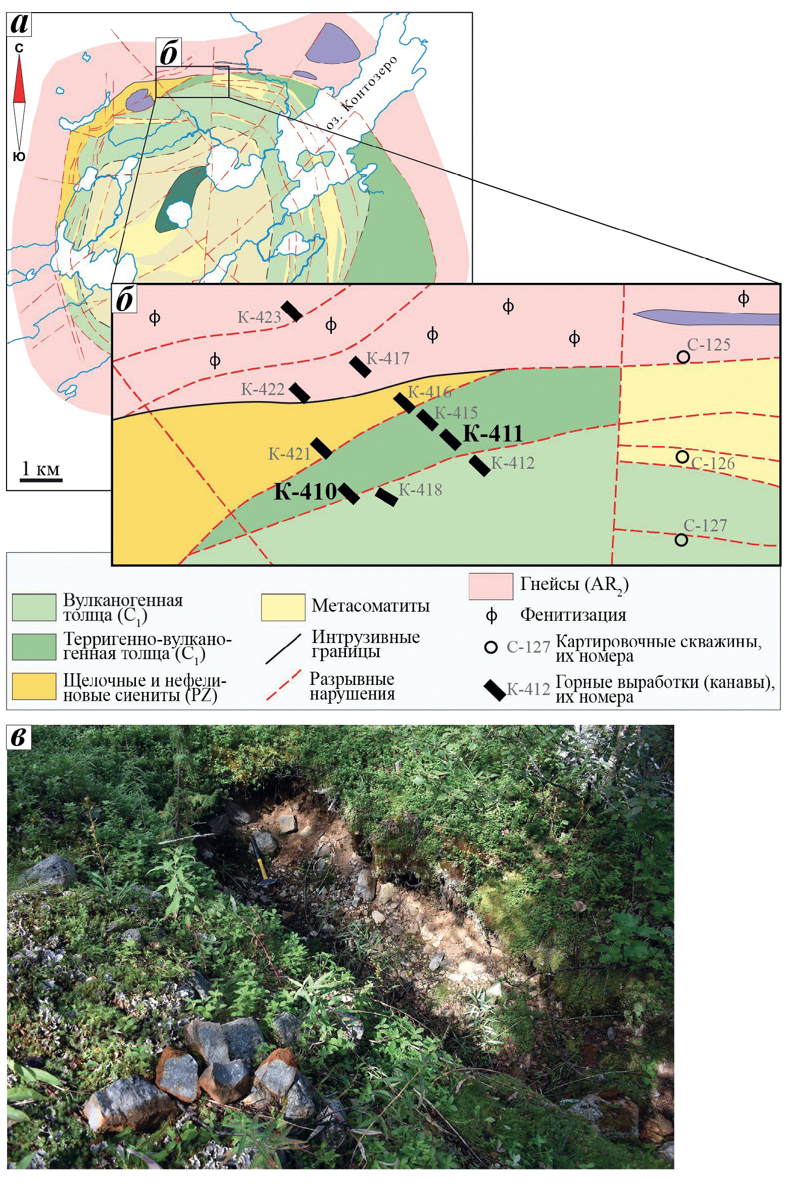 а — положение участка отбора образцов на геологической схеме Контозерского вулкано-плутонического комплекса; схема по (Сапрыкина и др., 1978), с упрощениями. Условные обозначения соответствуют рис. 1; б — схема участка отбора образцов с расположением канав и картировочных скважин по (Сапрыкина и др., 1978). Образцы для исследования были отобраны из канав К-410 и К-411 (выделены жирным шрифтом); в — общий вид горной выработки (канавы) до расчистки.