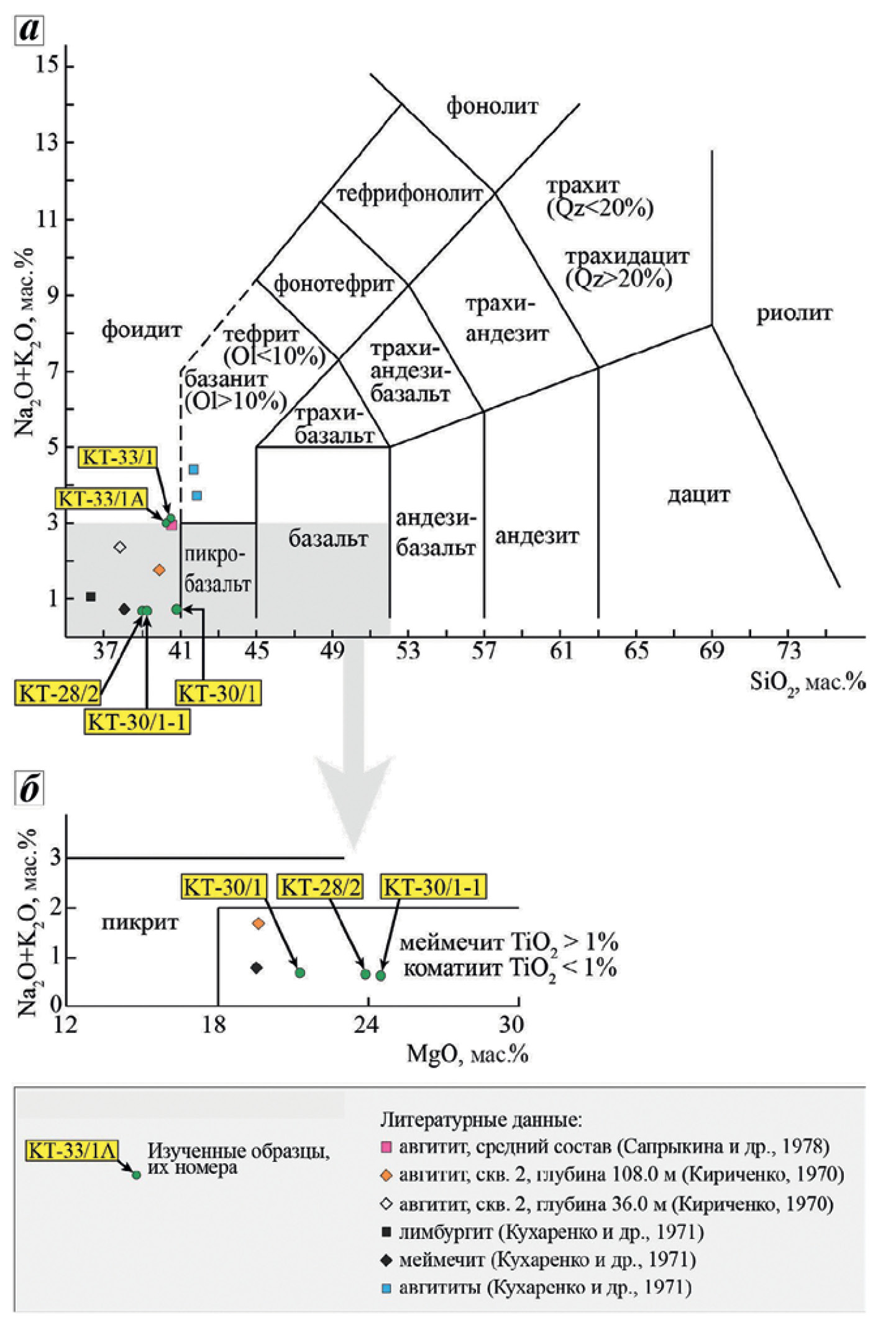 Согласно классификации (Igneous rocks…, 2005), образцы КТ-28/2, КТ-30/1, КТ-30/1—1 относятся к высокомагнезиальным породам, а именно — меймечитам, поскольку содержат 52 % > SiO2 > 30 %, MgO > 18 %, (Na2O + K2O) < 2 %, TiO2 > 1 %. Фигуративные точки, отвечающие этим образцам, показаны на диаграмме TAS (рис. 5, а), а также на диаграмме для высокомагнезиальных пород (рис. 5, б). Образцы пород КТ-33/1, КТ-33/1А не относятся к высокомагнезиальным и не являются нефелинитами или меланефелинитами. Эти породы классифицированы на основе диаграммы TAS: точки, отвечающие их составам, находятся в поле фоидитов. Дополнительно на диаграмму TAS и, в случае если порода относится к высокомагнезиальным, на диаграмму (Na2O + K2O)–MgO (рис. 5, б) нанесены точки, отвечающие составам авгититов, лимбургита и меймечита терригенно-вулканогенной толщи, взятым из литературных источников (Кириченко, 1970; Кухаренко и др., 1971; Сапрыкина и др., 1978).