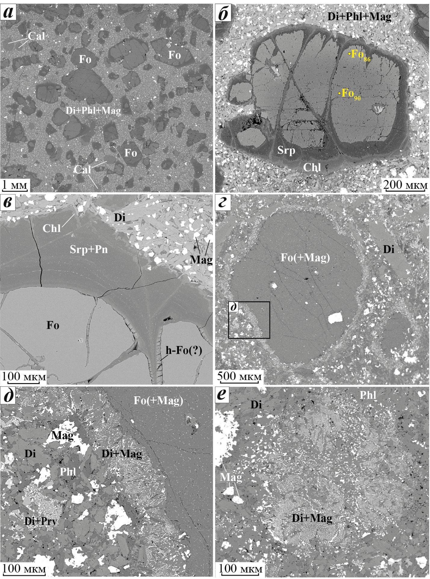 Пентландит — вторичный минерал меймечитов, образующийся при серпентинизации вкрапленников форстерита. Мельчайшие зерна пентландита часто располагаются тонкими цепочками в массе серпентина, окружающего форстерит (рис. 6, в). Пентландит диагностирован по рентгеновскому энергодисперсионному спектру.