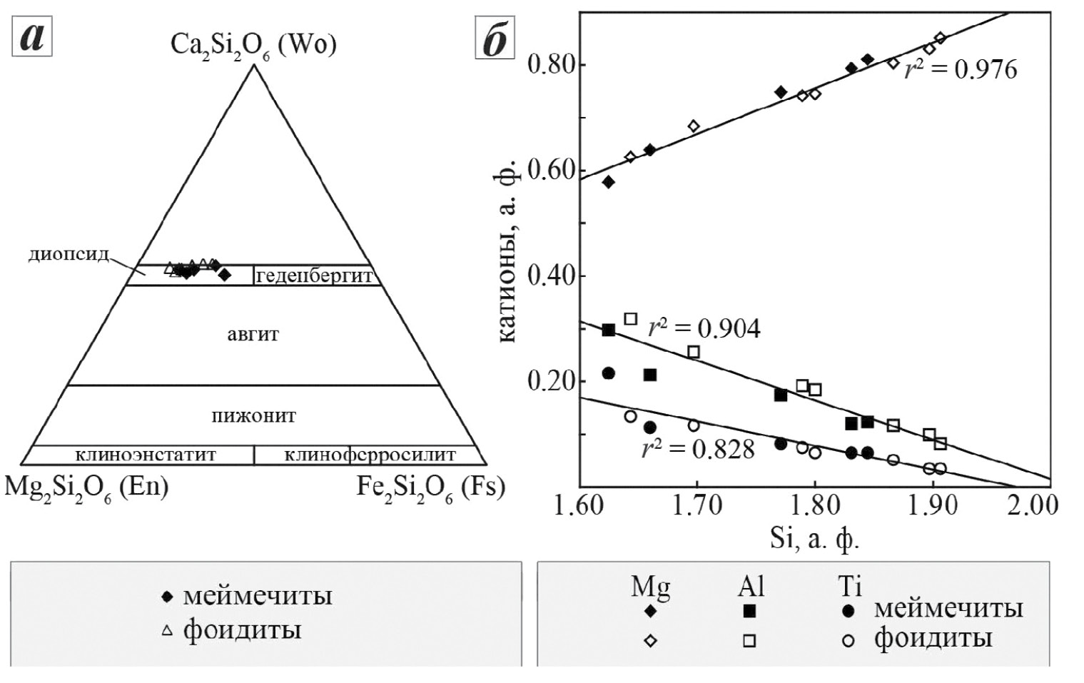По нашим данным, вхождение титана в структуру диопсида связано с замещением по схеме М1Ti + Т2Al ↔ М1Mg + Т2Si (рис. 8, б). Поскольку растворимость титана в клинопироксенах растет с уменьшением давления (Sepp, Kunzmann, 2001), увеличение содержания титана от центра к краю зональных вкрапленников диопсида (рис. 7, б, в; табл. 3, анализы 4 и 5) в фоидитах отражает, по-видимому, переход от плутонической стадии кристаллизации к приповерхностным условиям. По этой же причине диопсид в мелкозернистой массе фоидитов содержит больше титана, чем диопсид вкрапленников (табл. 3).