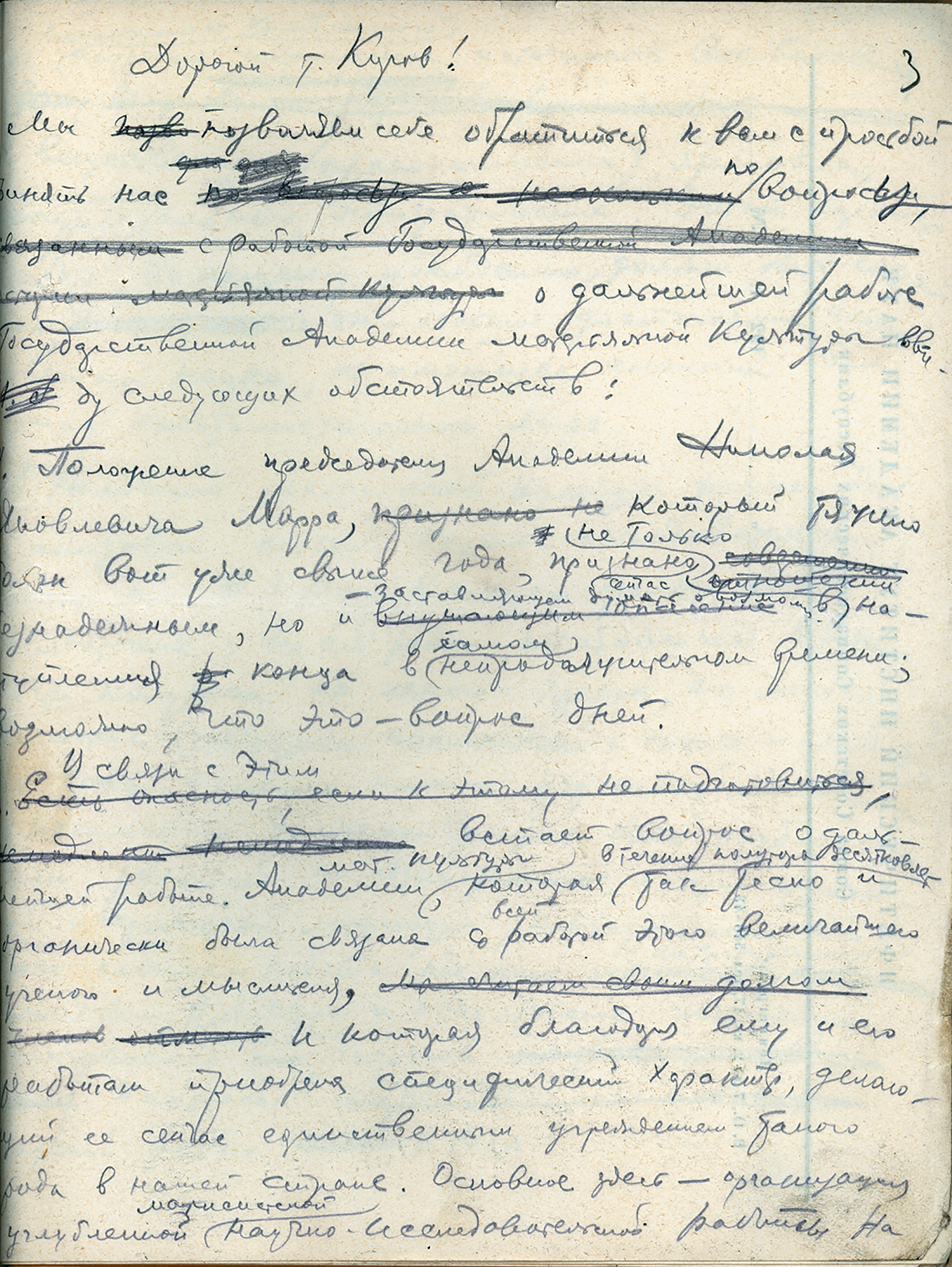 In 1934, the Academy for the History of Material Culture (SAHMC), a leading archaeological institution of Russia, faced a challenge. The Chairman of SAHMC, Academician Nikolai Ya. Marr, who had headed it for many years, was dying, and urgent measures had to be taken to ensure successful work of the Academy after his death. Deputy Chairman F.V. Kiparisov decided to address a letter to the party leader of Leningrad Sergey Kirov in order to secure the leading positions of SAHMC in science; he asked for a personal appointment with Kirov to discuss the future of the Academy and proposed a programme for further development of the institution. The drafts of the letter were prepared in November 1934, shortly before the assassination of S.M. Kirov, but the letter itself was probably never sent to the addressee. The papers are kept in the archival collection of SAHMC at Archives of the Institute for the History of Material Culture RAS. Its full publication will provide important new information on the history of SAHMC activities in the context of the general development of Russian academic science during the troubled period of the 1930s.