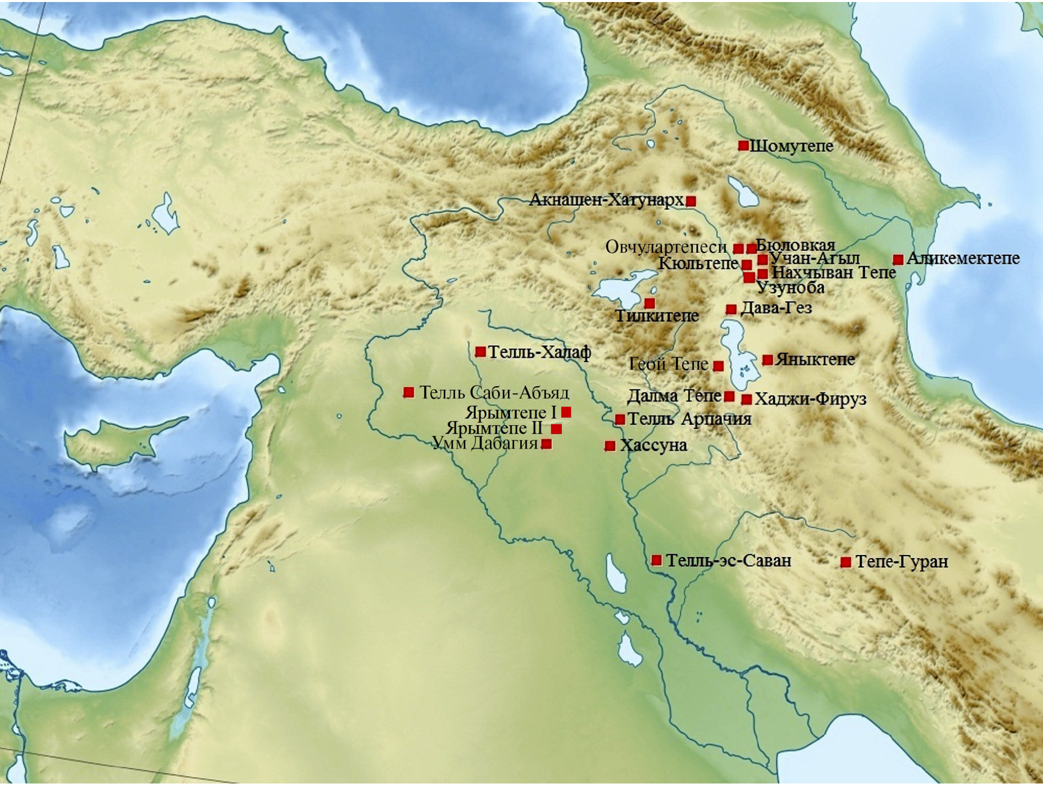 О формировании древнеземледельческих культур Южного Кавказа и об их связях имеются разные мнения. Некоторые исследователи предполагали, что неолитическая культура Южного Кавказа привнесена из стран Ближнего Востока (Ахундов, 2019. C. 98; Массон, 1964. C. 407), а другие говорили, что культура Кюльтепе формировалась на местной почве в тесном контакте с соседними ближневосточными регионами (Бахшалиев, 2022. С. 139). Однако этапы культурно-экономических связей культур Южного Кавказа с Ближним Востоком до сих пор хорошо не изучены. Причиной является то, что в начале XXI в. некоторые энеолитические поселения, такие как Арухло, Кюльтепе I, Шомутепе и другие, были отнесены исследователями к неолиту, вследствие чего между поздним неолитом и поздним энеолитом появился хронологический разрыв. Археологические памятники, выявленные исследованиями 2010–2021 гг. на территории Нахчывана – Нахчыван Тепе, Учан Агыл, Бюловкая, Узуноба (рис. 1), позволяют заполнить этот пробел несмотря на то, что их материалы до сих пор полностью не опубликованы.