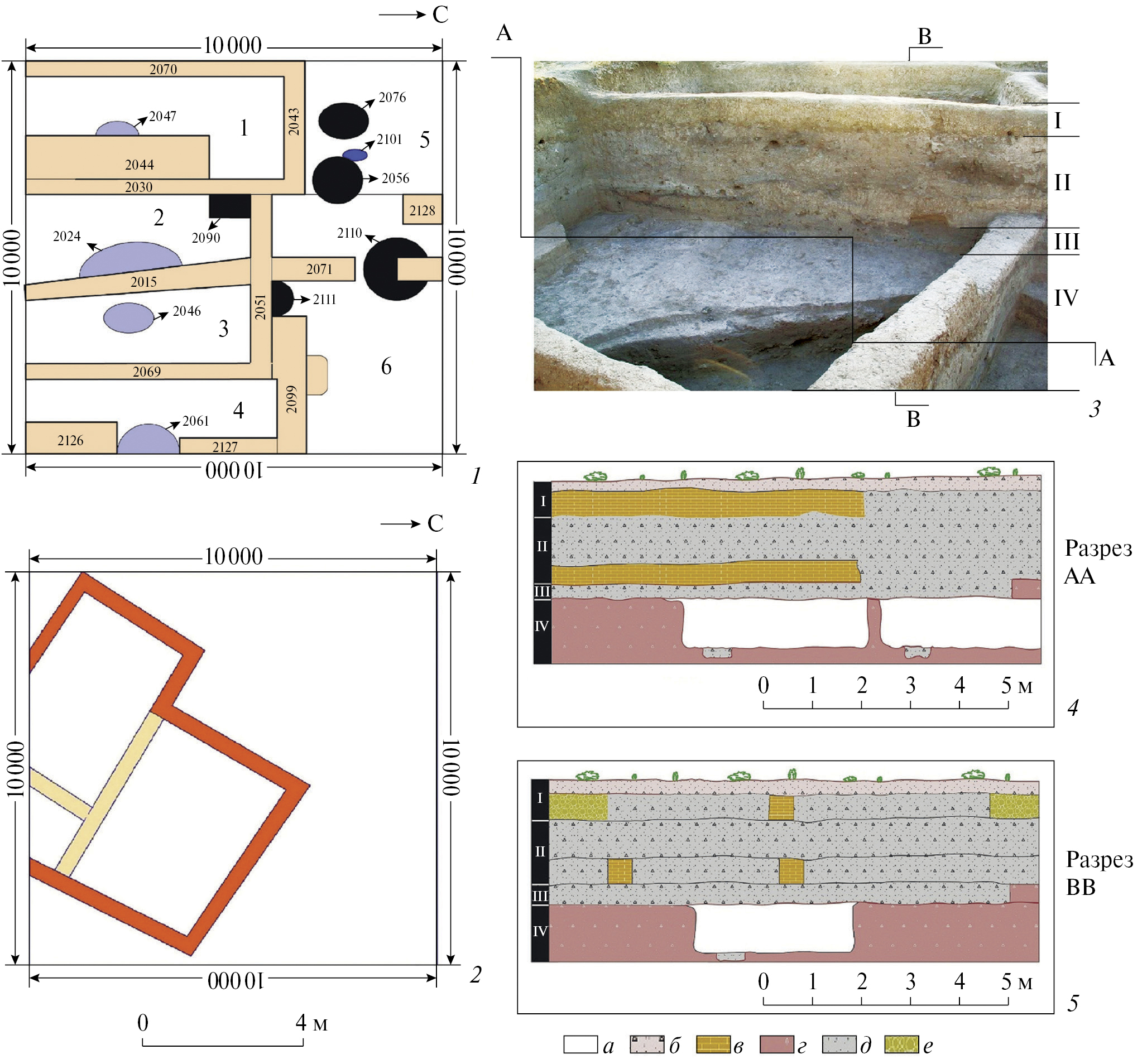 Рис. 2. Планы и разрезы раскопа на поселении Нахчыван Тепе: 1 – план первого горизонта; 2 – план второго горизонта; 3 – местоположение разрезов; 4, 5 – разрезы. Условные обозначения: а – полуземлянки; б – слой c мелкими фрагментами глинобитных конструкций; в – глинобитные строения; г – материк; д – золистый культурный слой; е – руинированные остатки глинобитных строений.