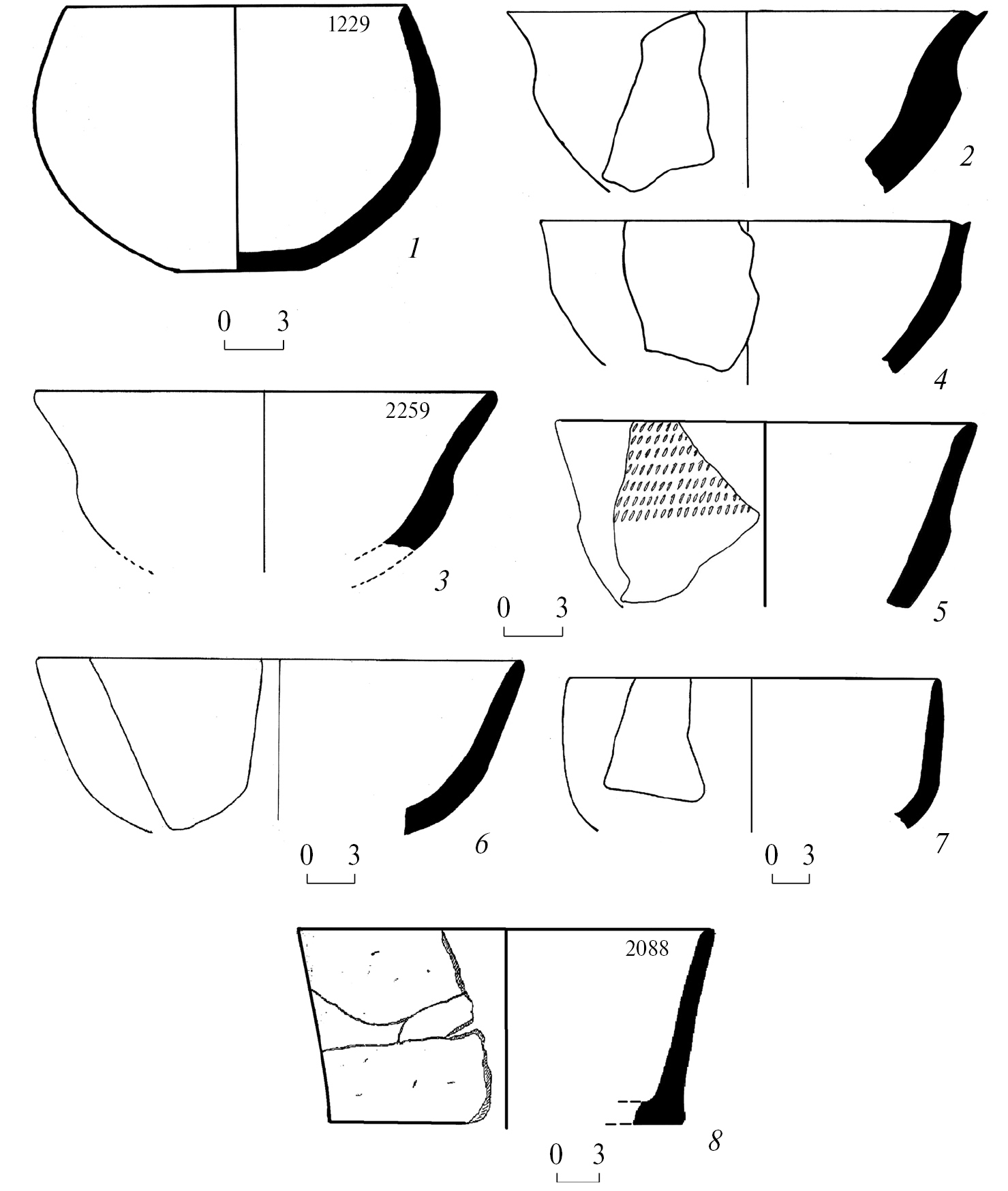 Fig. 3. Bowls: 1, 8 – Nakhchivan Tepe; 2–7 – Bulovkaya
