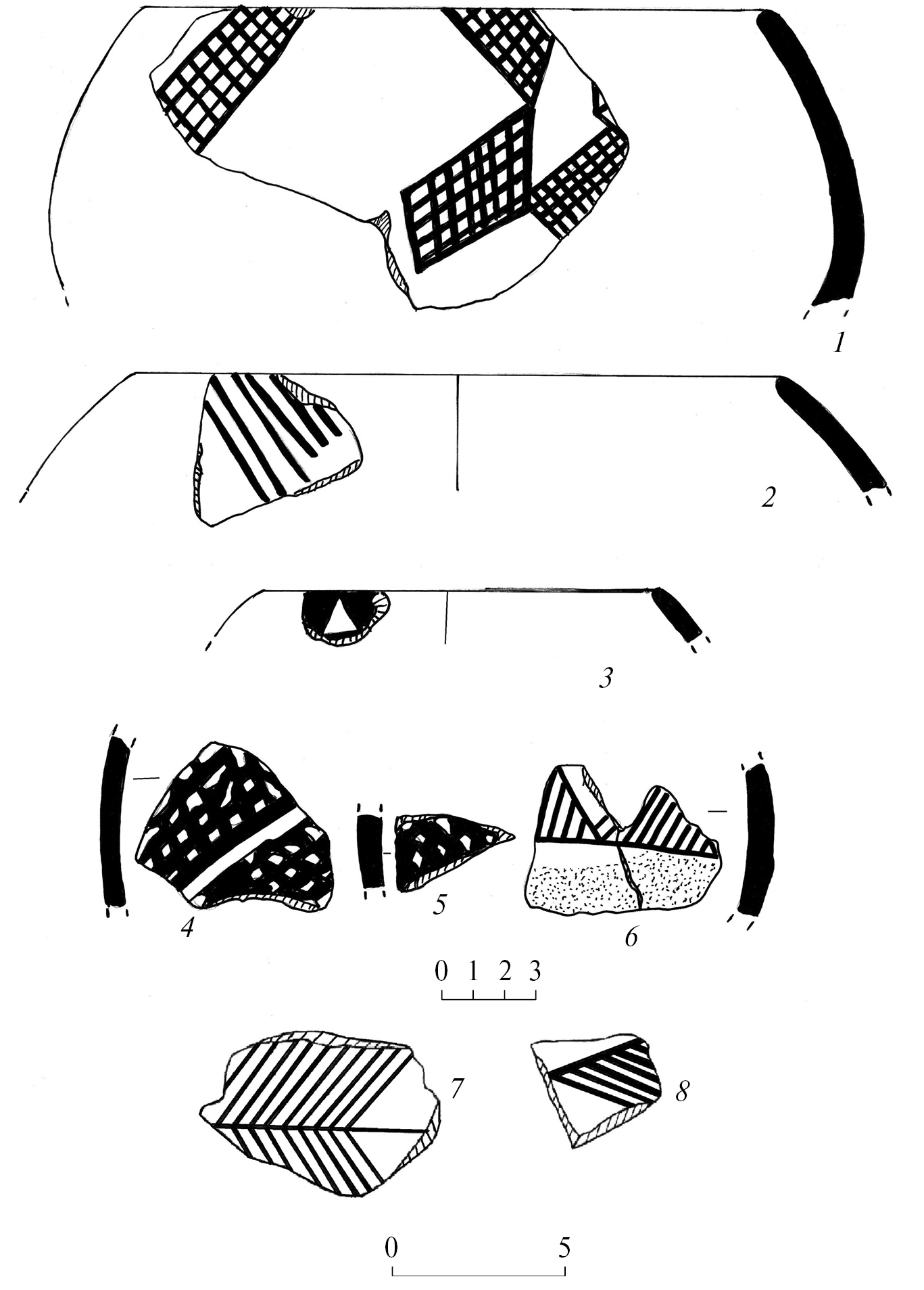 Fig. 6. Painted ceramics from the settlements of Uçan Ağıl (1–6) аnd Uzunoba (7, 8)