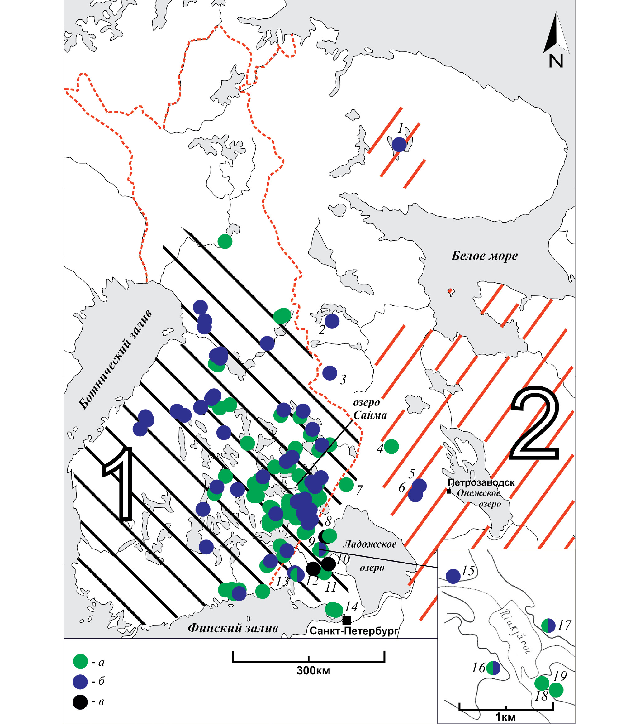 Рис. 1. Памятники с ранней асбестовой керамикой на территории России: 1 – Ловозеро 3 (7); 2 – Ломозеро 3 (5); 3 – Вирда I (6); 4 – Чудозеро IV (4); 5 – Сулгу Va (2); 6 –Курмойла I (3); 7 – Вяртсиля 5 (9); 8 – Ихоярви I (1), Вятиккя 1 (10), Куркиеки 52 (8); 9 – Озеро Синее 1 (23); 10 – Коннитса Айо (19); 11 – Ромашки (12); 12 – Синтола (22); 13 – Хяурюнмяки (20) и Селянкангас (21); 14 – Глиняный ручей (11) и Тарховская стоянка (13). На врезке: памятники окрестностей Каукола: 15 – Нёкёпельто (16), 16 – Канкаанмяки (14), 17 – Киёстялянхарью (15), 18 – Тиитунмяки Каллионвиери (18), 19 – Тиитунмяки Варпа (17) (по: Pälsi, 1915 Fig. 42). Условные обозначения: a – тип Кауниссаари, б – тип сперрингс, в – нет данных; ареалы: 1 – сперрингс 2 (по: Pesonen, 2021); 2 – ямочно-гребенчатой керамики. Здесь и на рис. 2–6 после названия памятника в скобках указан его номер в таблице.