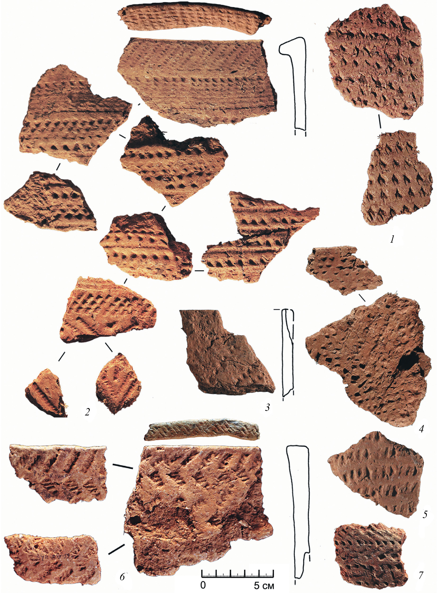 Использовались два элемента орнамента: ямки-наколы, выполненные торцом округлого штампа, напоминающего трубочку, и оттиски гребенчатого штампа. Наколы нанесены раздельно, иногда с небольшим отступанием, но, в отличие от “классического” сперрингс, без прочерчивания. Оттиски гребенчатого штампа часто нанесены с протаскиванием (рис. 4, 1) или “шаганием” (рис. 5, 1). Штампы короткие, с хорошо выраженными краями, с полукруглым профилем, часто имеют косую нарезку (имитация веревочки?). Иногда оттиски полукруглого штампа нанесены под углом и схожи с отпечатками края рыбьего позвонка (рис. 4, 6; 5, 2, 4).