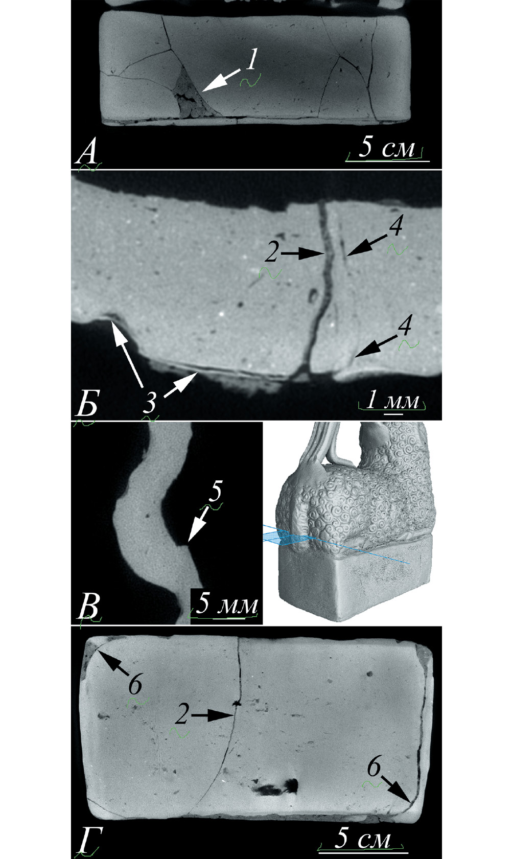 На фигурном сосуде в виде барана методом рентгеновской томографии выявляется большое количество хаотично расположенных трещин до 1.5 мм шириной, проникающих на всю толщину стенок объекта (рис. 3А, 1; 4, 2). Трещины частично заполнены реставрационным составом. В левой нижней части постамента наблюдается область утраты материала размерами до 32 × 32 мм (рис. 4А, 1). Она имеет неправильную форму и заполнена реставрационным составом. На некоторых участках поверхности сосуда дифференцируется слой толщиной 100-300 мкм, вероятно, являющийся лаковым покрытием (рис. 4Б, 3). Толщина этого слоя максимальна в углублениях рельефа поверхности. Сложность трактовки данных томографии по этому сосуду связана с наложением технологических швов и следов реставрационных работ. Однако можно выделить следующие элементы конструкции сосуда: ручка, горло, тулово и дно.