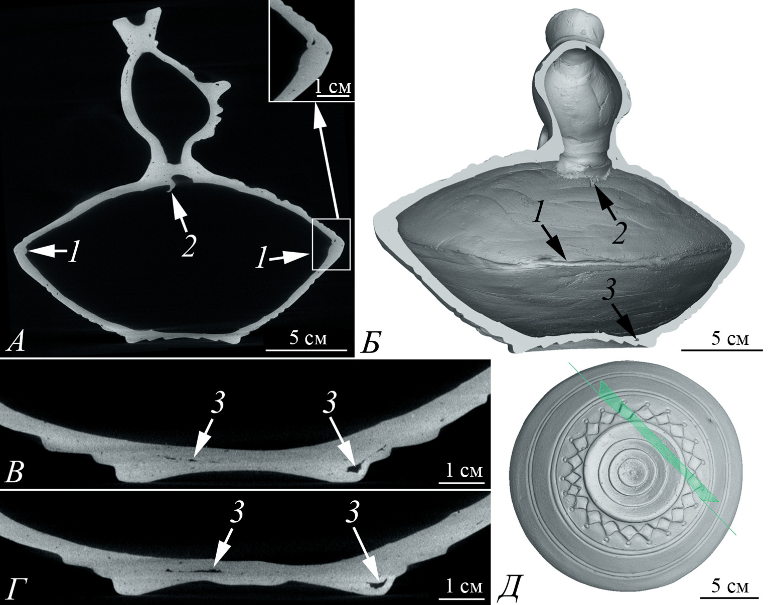 Рис. 8. Конструкция тулова лагиноса по результатам рентгеновской томографии: шов между верхней и нижней частями тулова, показанный на томографическом сечении (А) и модели внутренней поверхности (Б); зоны крепления декоративных элементов на дне сосуда (В, Г), положение секущей плоскости показано на (Д) 1 – налеп в зоне соединения верхней и нижней частей тулова; 2 – загиб материала вокруг отверстия в верхней части тулова; 3 – вытянутые полости между частями декоративных элементов, расположенных на дне.
