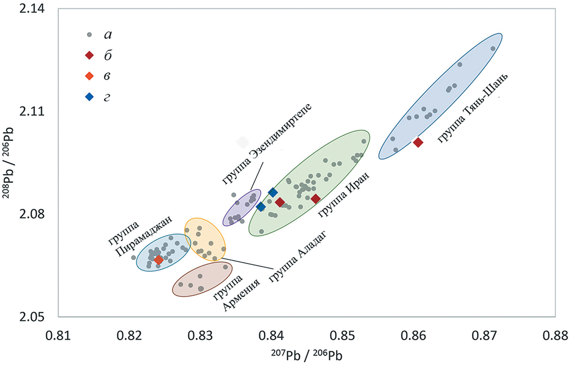 Повышенные уровни висмута фиксируются в металле, поступавшем из контролируемых Саманидами регионов Центральной Азии и Афганистана в X в. (Ениосова, Митоян, 2011. С. 93). В этом серебре, как правило, содержание 208Pb/206Pb по отношению к 207Pb/206Pb выше, чем в европейском металле X–XI вв. (Merkel, 2016). На рис. 6, 2 восточное серебро не только отображается на отдельной линии тренда выше европейского серебра, но и демонстрирует значительно больший диапазон отношений изотопов свинца.