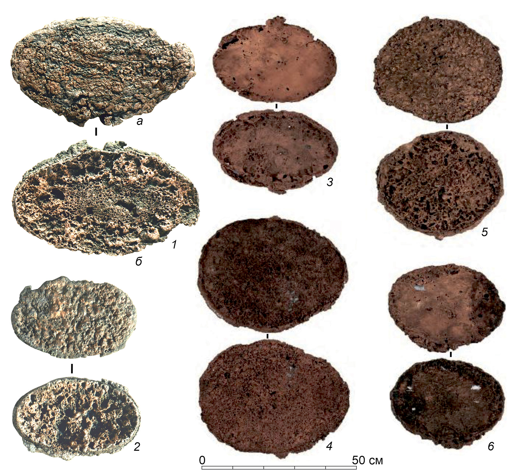 Действительно, форма слитков напрямую связана с многоступенчатым пирометаллургическим процессом переработки сульфидных медных руд и соответствует либо контурам чашеобразной ямы, в которую выпускали из плавильной печи расплавленный металл, либо повторяет форму изложницы, заполняемую рафинированной медью с помощью черпака (Агрикола, 1962. С. 341–386, 459–494; Garbacz-Klempka et al., 2014. P. 104)1.