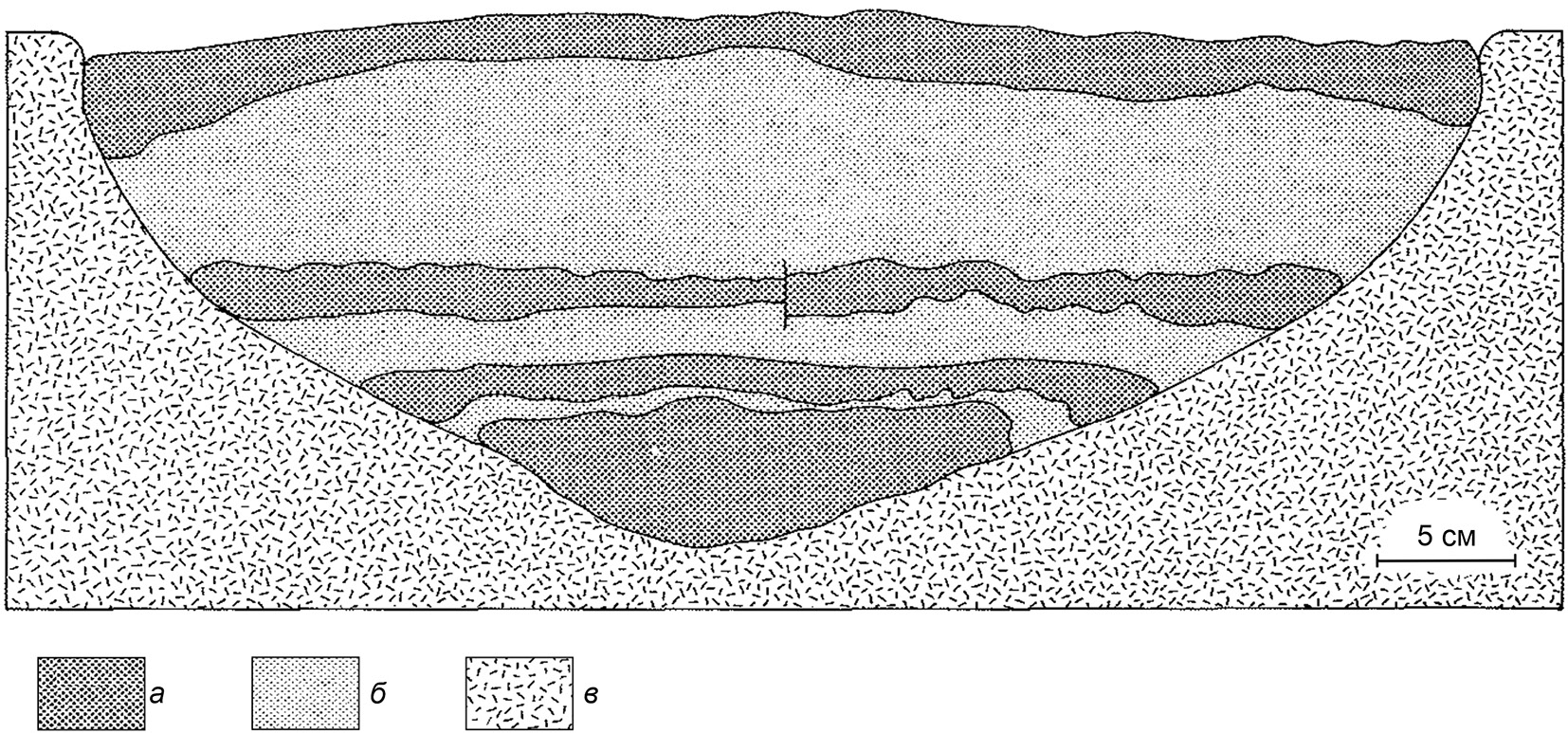 Рис. 3. Схематический разрез предгорновой ямы. Реконструкция по находкам слитков Reißscheiben на о. Гельголанд (по: Hänsel, Schulz, 1980. Bild 9). Условные обозначения: а – плоские слитки уменьшающегося диаметра и полусферический слиток-“королек” (археологические находки); б – расплав; в – утрамбованный песок/земля.