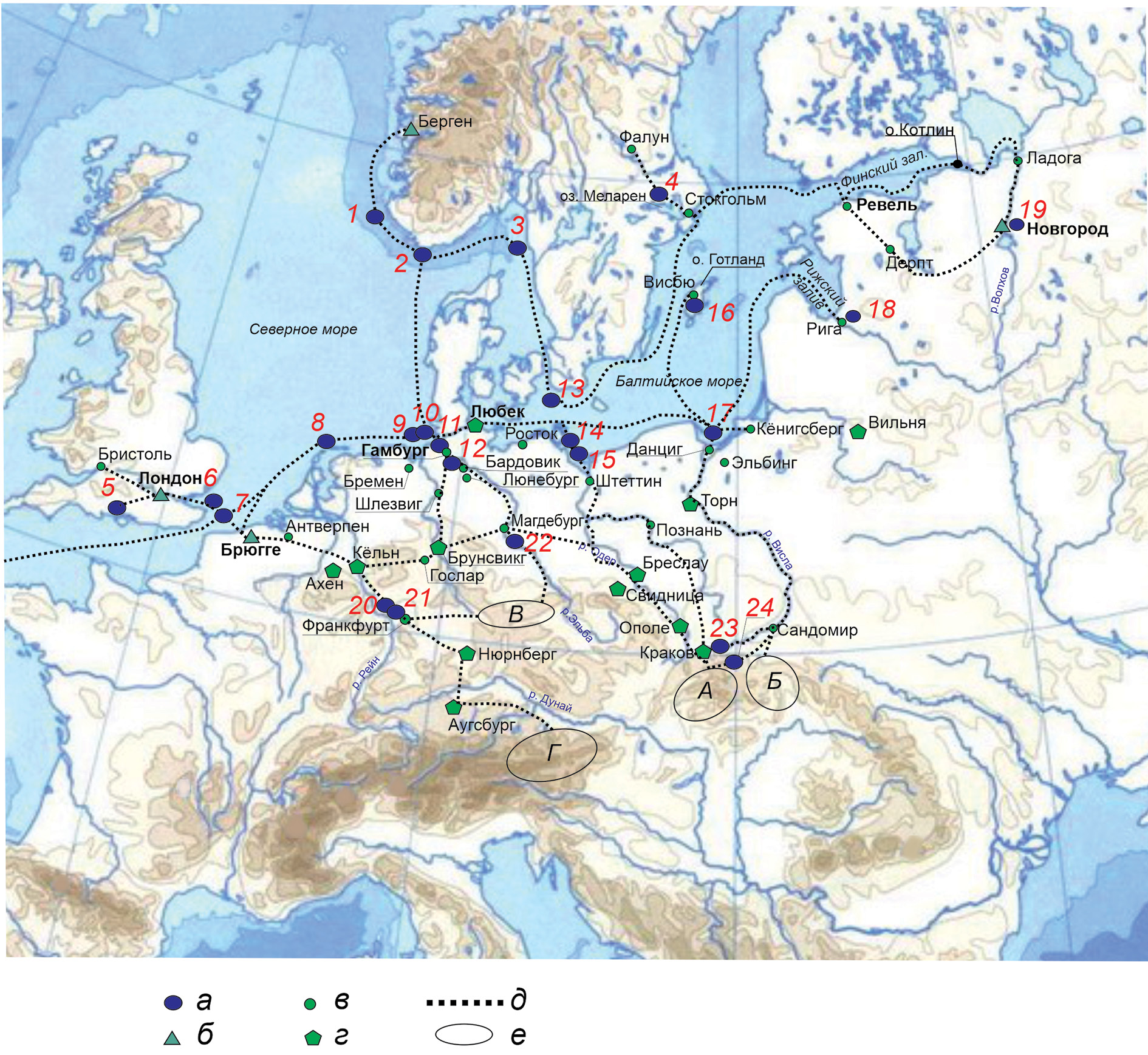 Рис. 4. Топография находок слитков-“лепешек” и торговые пути. 1 – Ставангер; 2 – судно “Селюр 3”; 3 – судно “Скафте”; 4 – Харакер; 5 – Бромхэм; 6, 7 – Великобритания; 8 – Терсхеллинг; 9 – рифтовая зона о. Гельголанд; 10 – о. Гельголанд; 11 – р. Эльба, вблизи г. Ведель; 12 – судно “Эльберврак”, р. Эльба; 13 – судно “Треллеборг Коппервракет”; 14 – судно “Менчгут 92”; 15 – судно “Херингсдорф 58”; 16 – Готланд; 17 – “Медный корабль”; 18 – Латвия; 19 – Великий Новгород; 20 – Браунфельс-Филиппстейн; 21 – “Вецлар-Штайндорфский клад”; 22 – р. Эльба, вблизи г. Виттенберг; 23 – Краков, Главная рыночная площадь; 24 – р. Дунаец. Условные обозначения: а – места обнаружения слитков: б – конторы Ганзы (зарубежные торговые представительства); в – ганзейские фактории и торговые города; г – крупные металлургические центры; д – торговые пути; е – горнорудные районы: А, Б – Западные Карпаты; В – Рудные горы и Богемия; Г – Восточные Альпы.