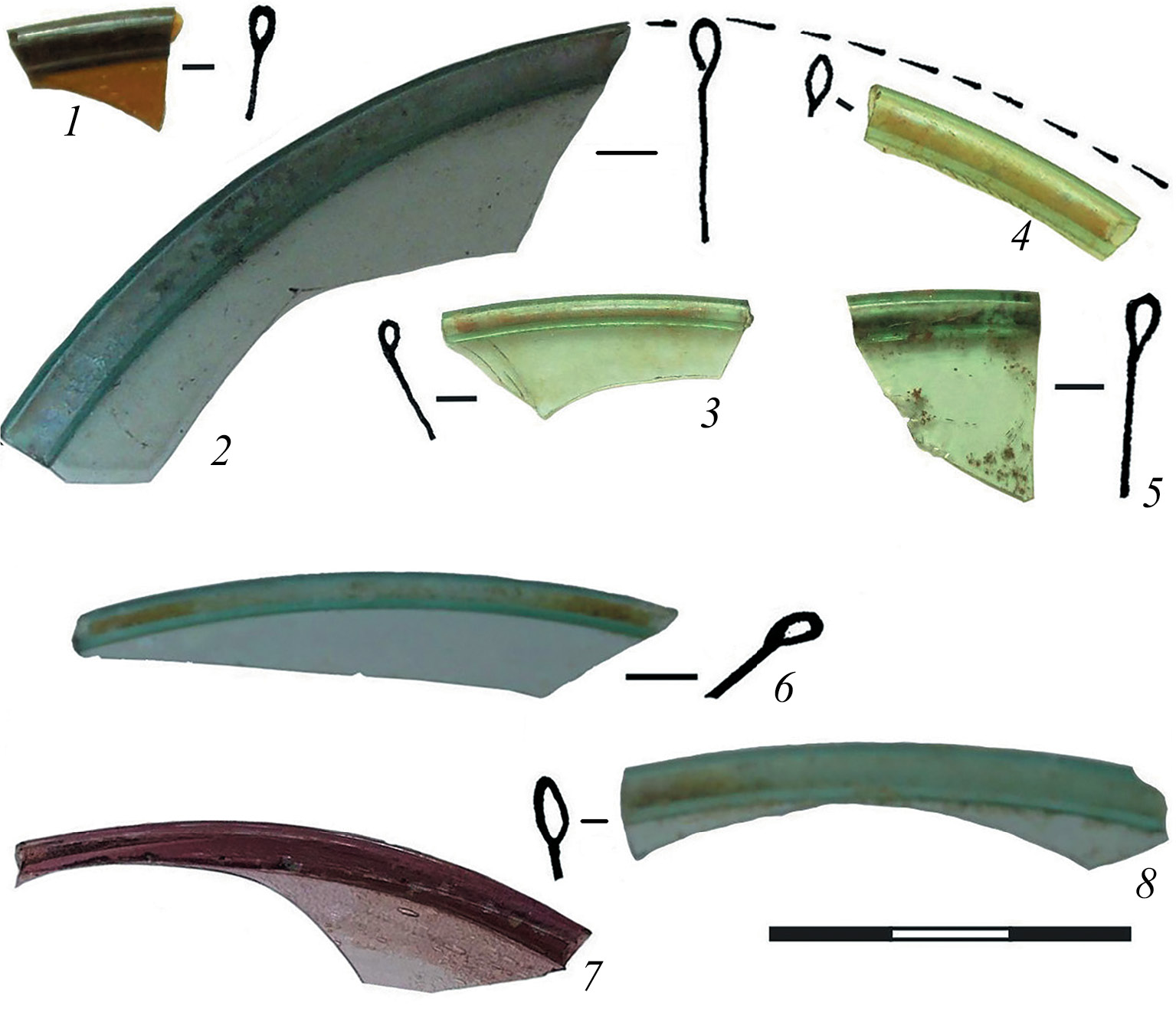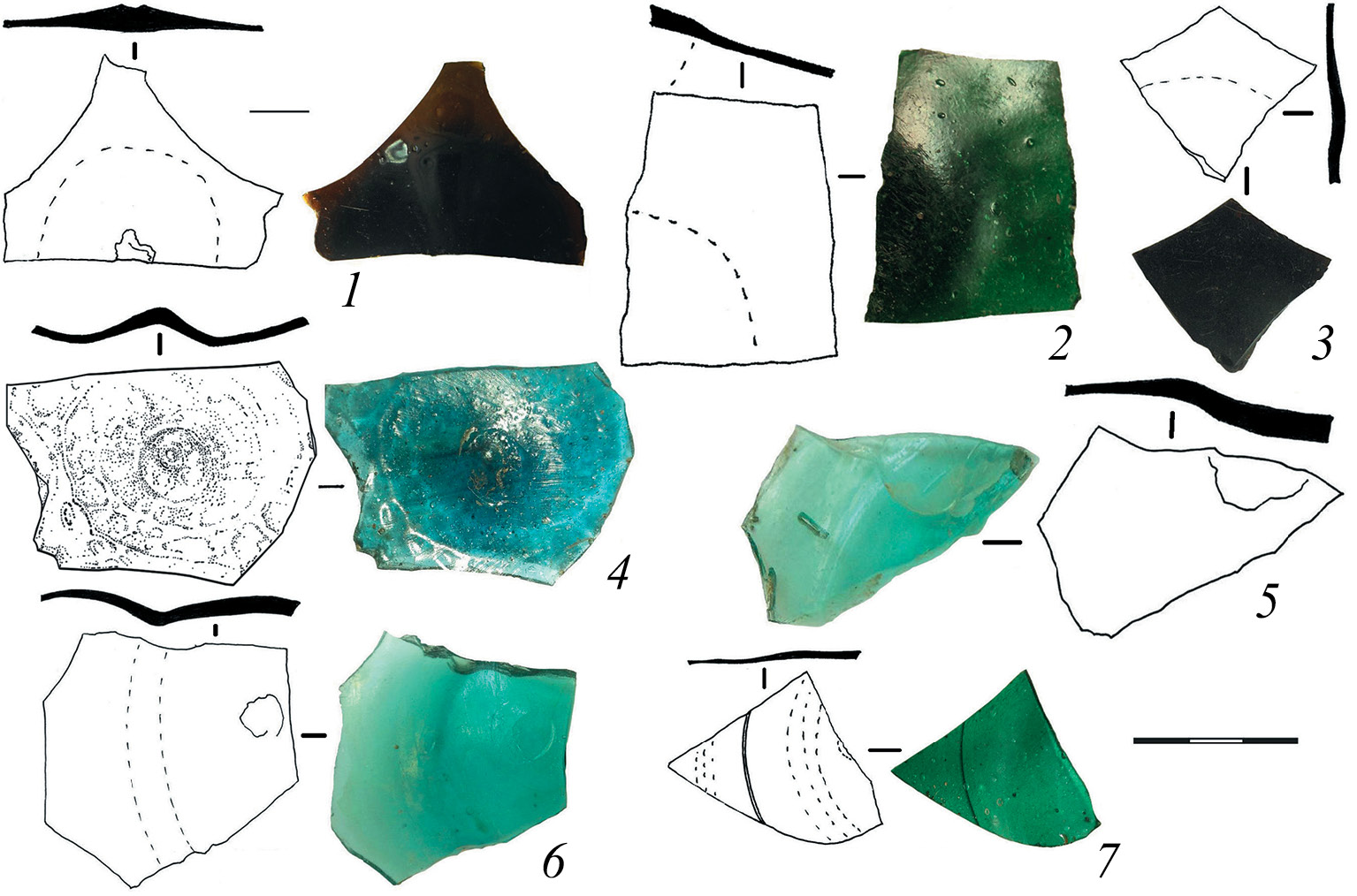 Fig. 5. Edges of window discs of the first type. 1, 7 – Coloured glass