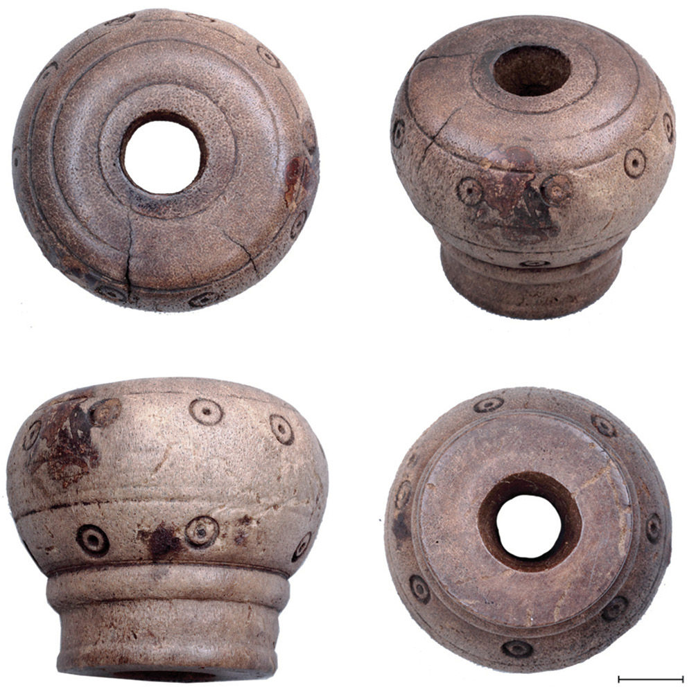 Очевидно, к другим инструментам – шильям, резцам, возможно, металлическим печатям – по аналогии с более поздними образцами деревянных изделий (Чекунина, 2015. Рис. 1), принадлежали три рукояти более сложных форм, выточенные на токарном станке из рога лося или оленя и украшенные циркульным орнаментом (рис. 2, 1, 2; рис. 3). На рукояти грибовидной формы длиной 5.5 см декор располагался вертикальными рядами вдоль длинной втулки (рис. 2, 1), при этом он почти стерт от долгого использования предмета, на других – циркульный орнамент расположен в один горизонтальный ряд в сочетании с резными линиями и рельефом.